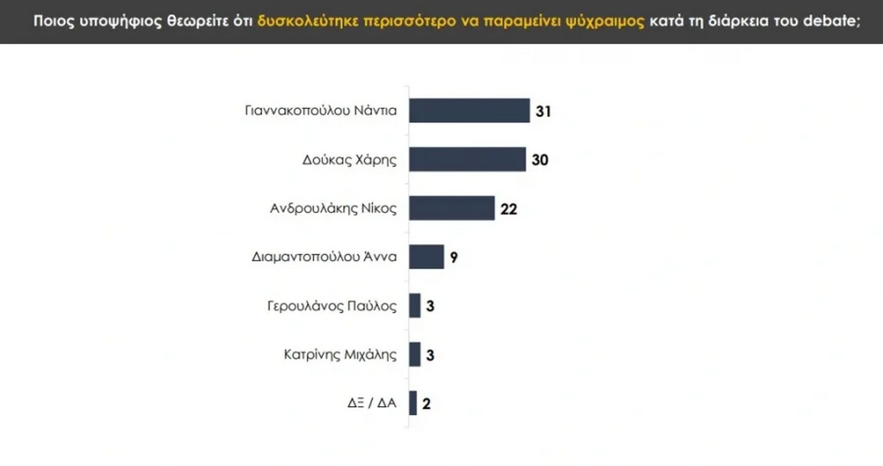 Στη συνέχεια, στην ερώτηση «Ποιος υποψήφιος θεωρείτε ότι δυσκολεύτηκε περισσότερο να παραμείνει ψύχραιμος κατά τη διάρκεια του debate;», τα αποτελέσματα της δημοσκόπησης είναι: