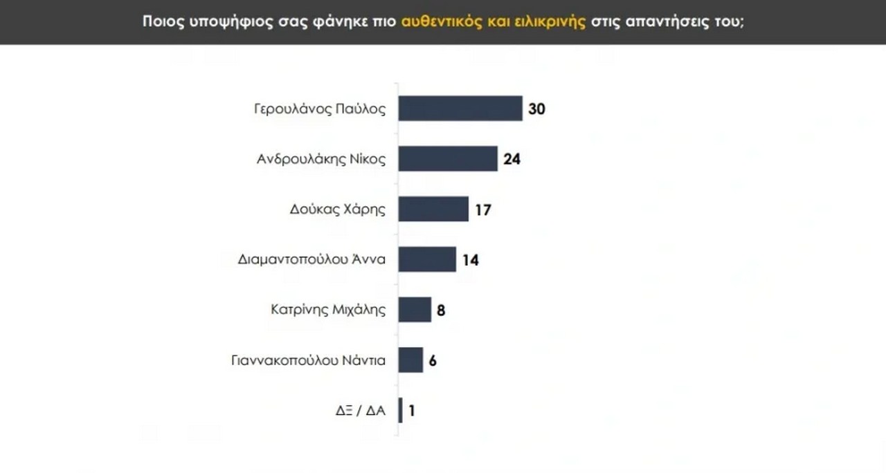 Στην ερώτηση «Ποιος υποψήφιος σας φάνηκε πιο αυθεντικός και ειλικρινής στις απαντήσεις του;» τα αποτελέσματα της δημοσκόπησης είναι: