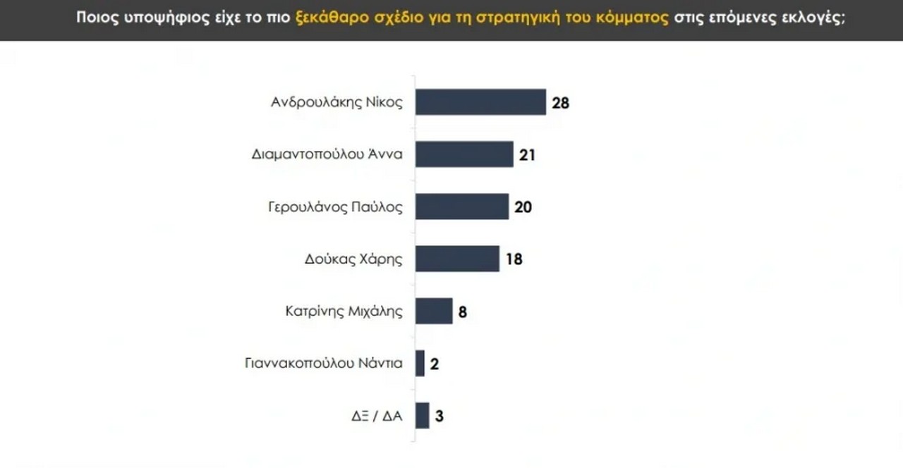 Στη συνέχεια, οι ερωτηθέντες κλήθηκαν να απαντήσουν στο ερώτημα «Ποιος υποψήφιος είχε το πιο ξεκάθαρο σχέδιο για τη στρατηγική του κόμματος στις επόμενες εκλογές;». Τα αποτελέσματα της δημοσκόπησης είναι τα εξής:
