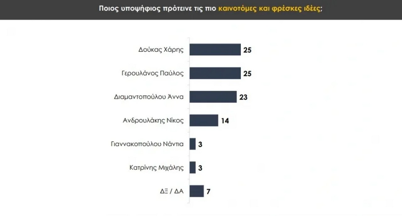 Τέλος, σχετικά με το ποιος υποψήφιος πρότεινε τις πιο καινοτόμες και φρέσκες ιδέες, τα αποτελέσματα της δημοσκόπησης είναι τα εξής: