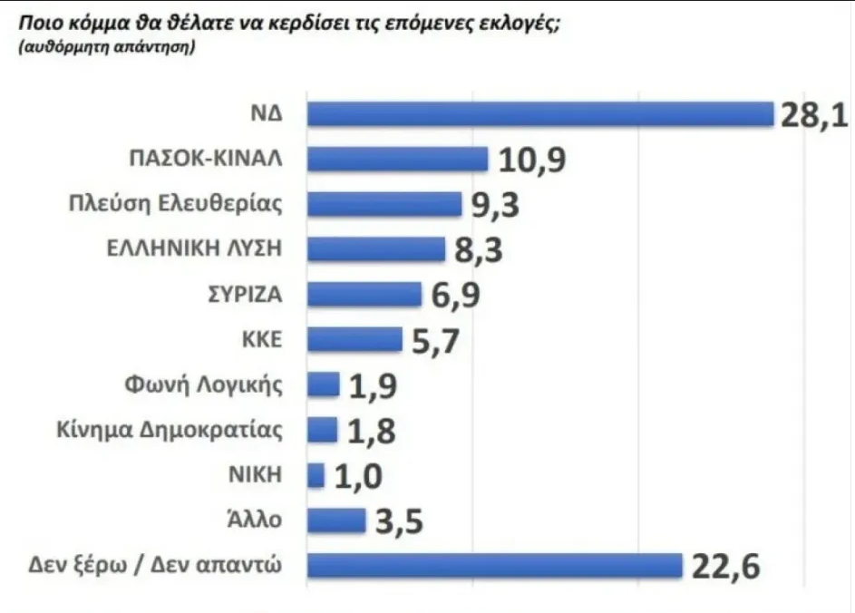 Εκτίμηση πρόθεσης ψήφου ΝΔ 30,3% ΠΑΣΟΚ ΚΙΝΑΛ 14,7% ΠΛΕΥΣΗ ΕΛΕΥΘΕΡΙΑΣ 14,6% ΕΛΛΗΝΙΚΗ ΛΥΣΗ 10,8% ΚΚΕ 8,4% ΣΥΡΙΖΑ 6,1% ΦΩΝΗ ΛΟΓΙΚΗΣ 3,5% ΚΙΝΗΜΑ ΔΗΜΟΚΡΑΤΙΑΣ 2,8% ΝΙΚΗ 2,6% ΝΕΑ ΑΡΙΣΤΕΡΑ 1,8% ΜέΡΑ25 1,2% ΑΛΛΟ 3,2%