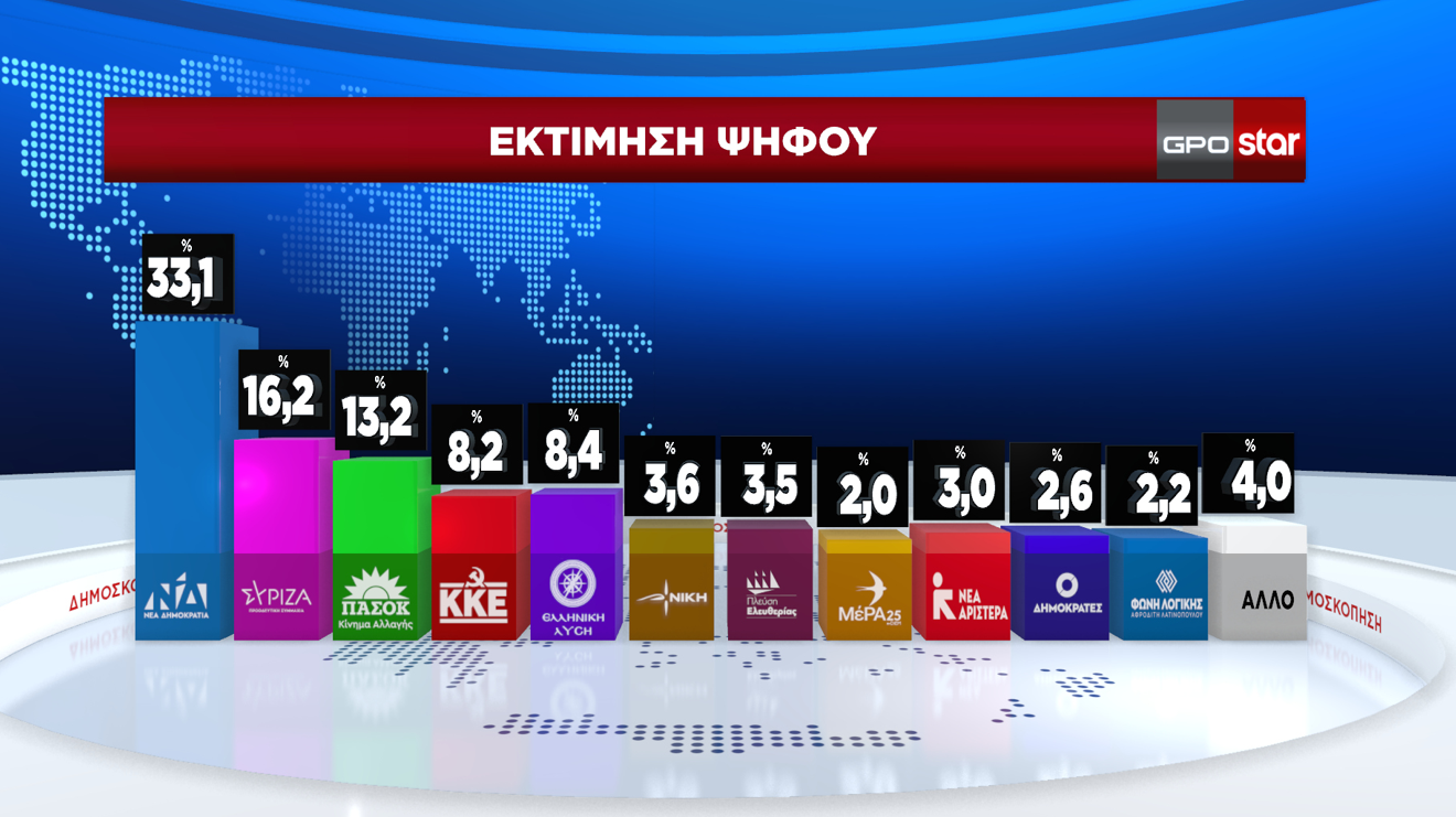 Στην εκτίμηση ψήφου η ΝΔ συγκεντρώνει 33,1%, ο ΣΥΡΙΖΑ 16,2% και το ΠΑΣΟΚ 13,2%. Ακολουθούν: Ελληνική Λύση 8,4%, ΚΚΕ 8,2%, ΝΙΚΗ 3,6%, Πλεύση Ελευθερίας 3,5%, Νέα Αριστερά 3%, Δημοκράτες 2,6%, Φωνή Λογικής 2,2% και Μέρα25 2%.