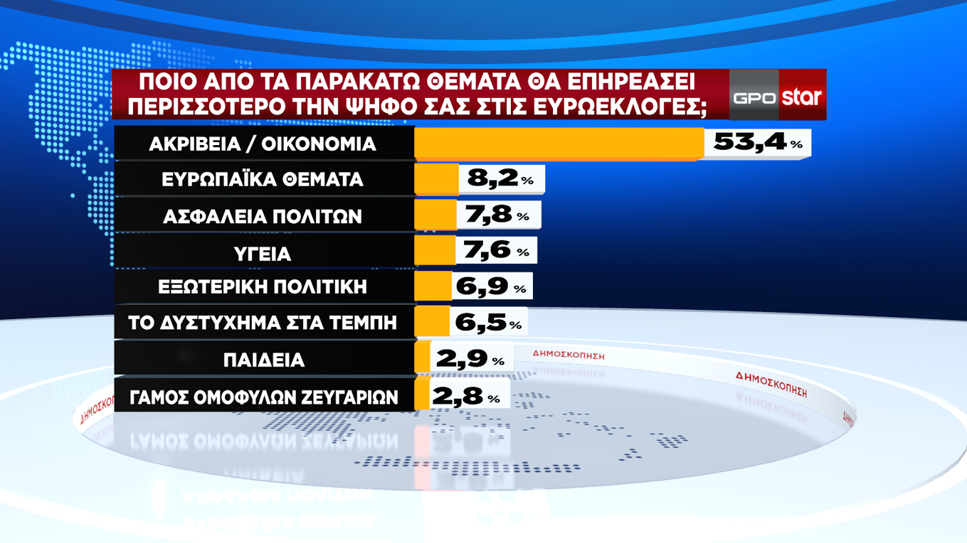 Το 8,2% θα επηρεαστεί από ευρωπαϊκά θέματα και ακολουθούν με μικρότερα ποσοστά η ασφάλεια, η Υγεία, η εξωτερική πολιτική, τα Τέμπη, η Παιδεία και ο γάμος των ομόφυλων ζευγαριών.
