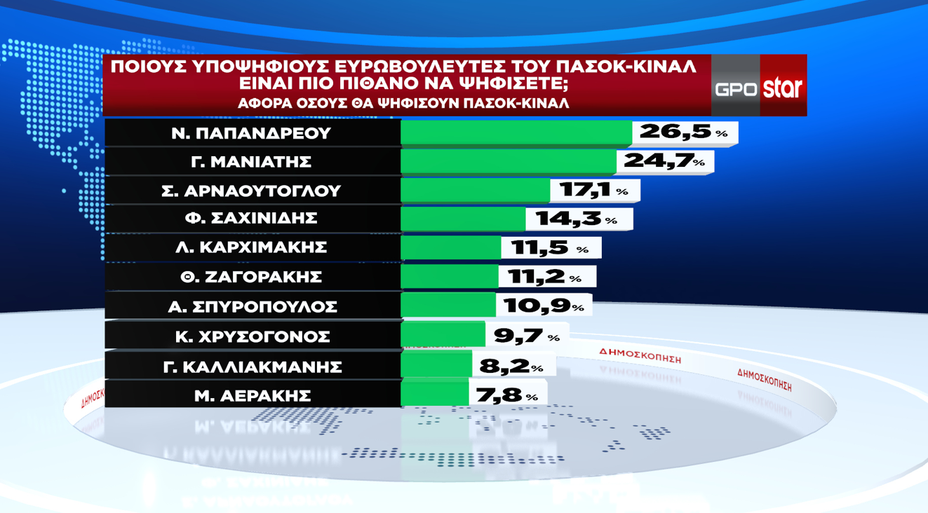 Αντίστοιχα στην πρώτη πεντάδα των υποψηφίων του ΠΑΣΟΚ πρώτος είναι ο Νίκος Παπανδρέου με 26,5%, δεύτερος ο Γιάννης Μανιάτης με 24,7% και ακολουθούν Σάκης Αρναούτογλου, Φίλιππος Σαχινίδης και Λευτέρης Καρχιμάκης.