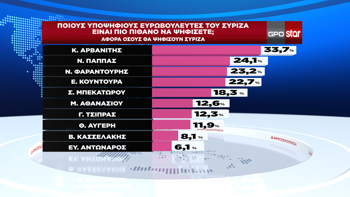 Στην πρώτη πεντάδα των υποψηφίων του ΣΥΡΙΖΑ προηγείται ο Κώστας Αρβανίτης με 33,7% και ακολουθούν: Νίκος Παππάς 24,1%, Νικόλας Φαραντούρης 23,2%, Έλενα Κουντουρά 22,7% και Σοφία Μπεκατώρου 18,3%.