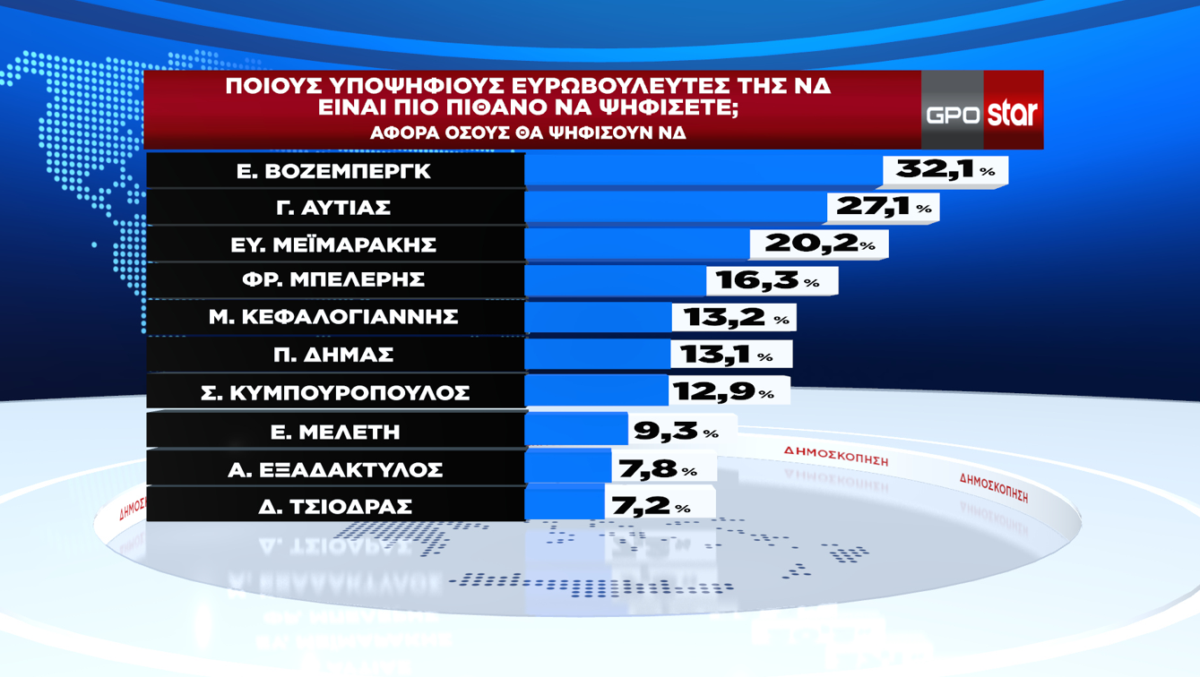 Μεταξύ των υποψήφιων ευρωβουλευτών της ΝΔ πρώτη στις προτιμήσεις των ερωτηθέντων έρχεται η Ελίζα Βόζεμπεργκ με 32,1%. Και ακολουθούν: Γιώργος Αυτιάς 27,1%, Βαγγέλης Μεϊμαράκης 20,2%, Φρέντης Μπελέρης 16,3%, Μανώλης Κεφαλογιάννης 13,2%, Πύρρος Δήμας 13,1%, Στέλιος Κυμπουρόπουλος 12,9%, Ελεονώρα Μελέτη 9,3%, ενώ την πρώτη δεκάδα συμπληρώνουν ο Αθανάσιος Εξαδάκτυλος και ο Δημήτρης Τσιόδρας.