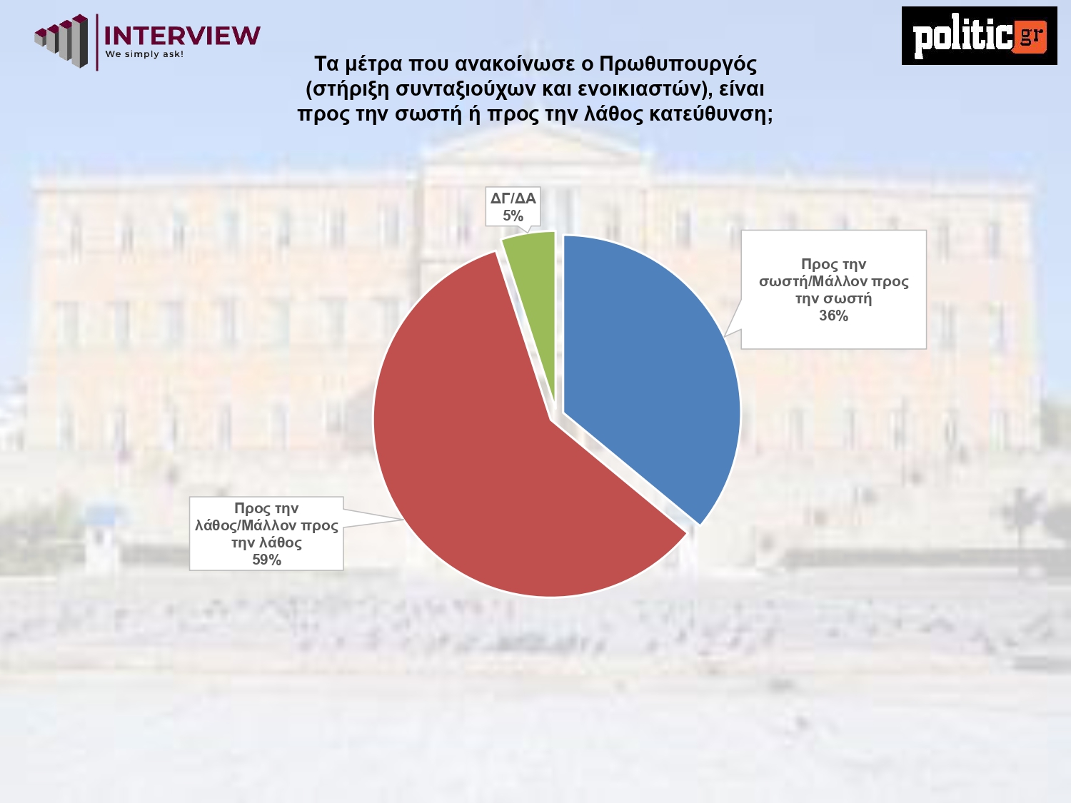 Τα μέτρα στήριξης που ανακοίνωσε ο πρωθυπουργός για συνταξιούχους και ενοικιαστές δεν αλλάζουν το κλίμα. Το 59% των ερωτηθέντων θεωρεί ότι κινούνται σε λάθος κατεύθυνση, σε αντίθεση με το 36% που τα κρίνει θετικά.