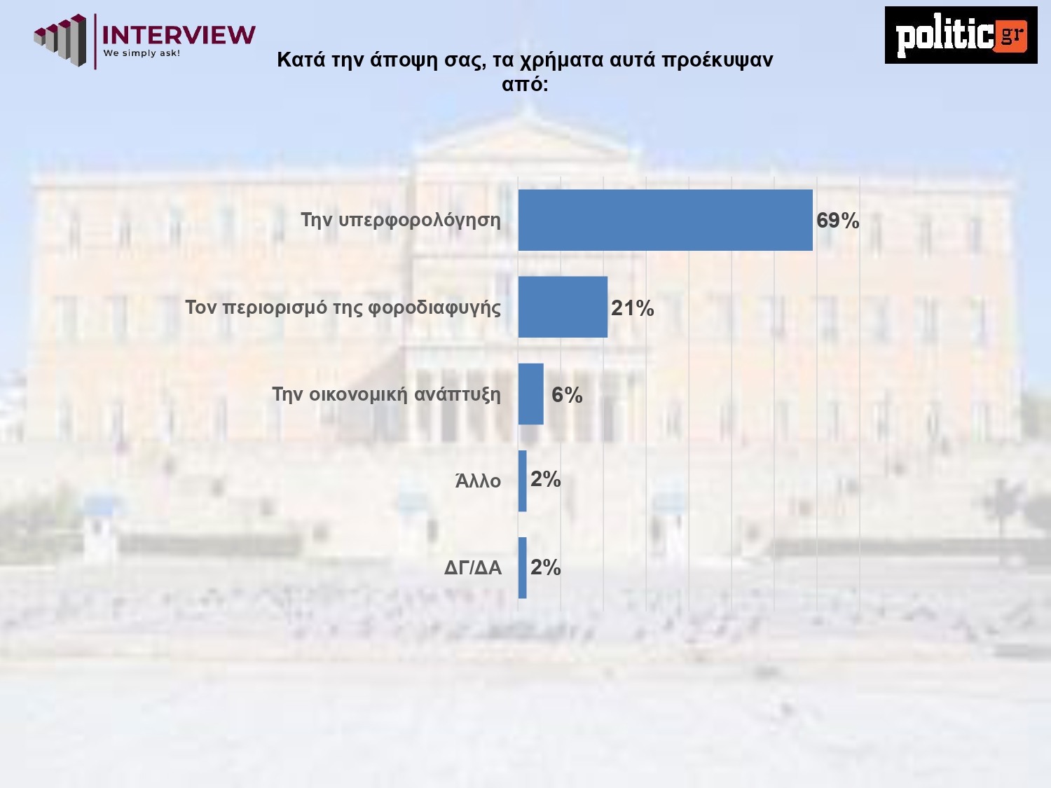 Ιδιαίτερα εντυπωσιακό είναι το εύρημα σύμφωνα με το οποίο, η συντριπτική πλειοψηφία των πολιτών (69%) θεωρεί ότι τα χρήματα για τις παροχές προέρχονται από την υπερφορολόγηση, και μόλις το 6% αποδίδει τα ποσά σε οικονομική ανάπτυξη. Το 21% αποδίδει τα ποσά στον περιορισμό της φοροδιαφυγής.