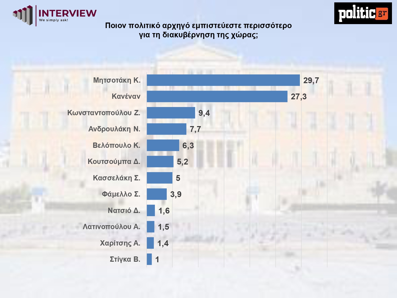 Το σάρωμα της δυσπιστίας προς το σύνολο της πολιτικής τάξης αποτυπώνεται ξεκάθαρα: σχεδόν ένας στους τέσσερις πολίτες αρνείται να δώσει εμπιστοσύνη σε οποιονδήποτε πολιτικό αρχηγό. Ο Κυριάκος Μητσοτάκης προηγείται με 29,7%, αλλά ο «κανένας» τον ακολουθεί κατά πόδας με 27,3%.