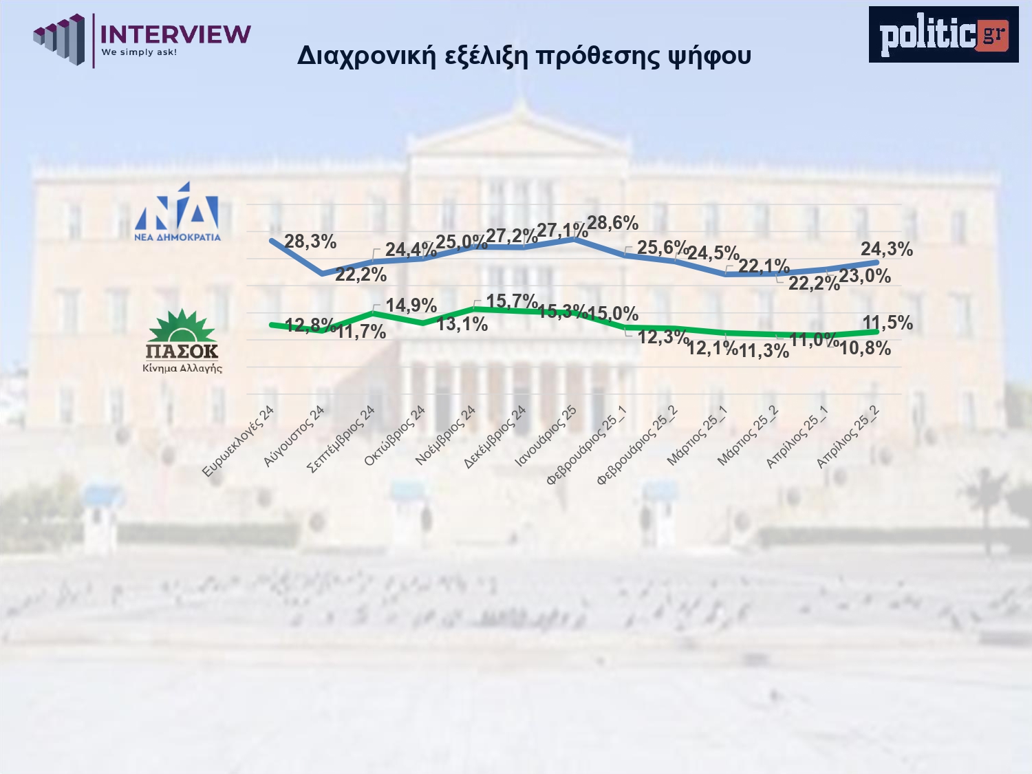 Μετά από μήνες φθοράς, η ΝΔ καταγράφει μικρή άνοδο 2,1 μονάδων σε σχέση με τον Μάρτιο. Ωστόσο, η απόσταση από την αυτοδυναμία παραμένει σημαντική, όπως δείχνει η νέα δημοσκόπηση της Interview για την POLITIC, καθώς το 24,3% εξακολουθεί να θεωρείται ποσοστό χαμηλής συσπείρωσης για κυβερνών κόμμα.