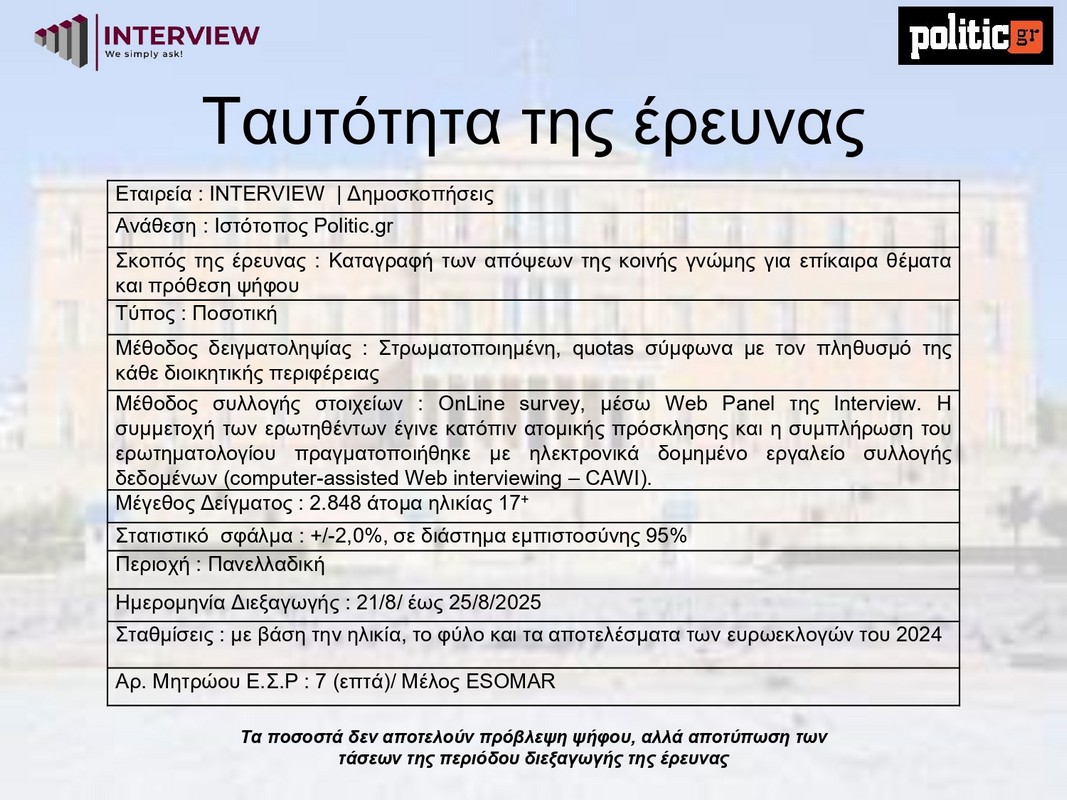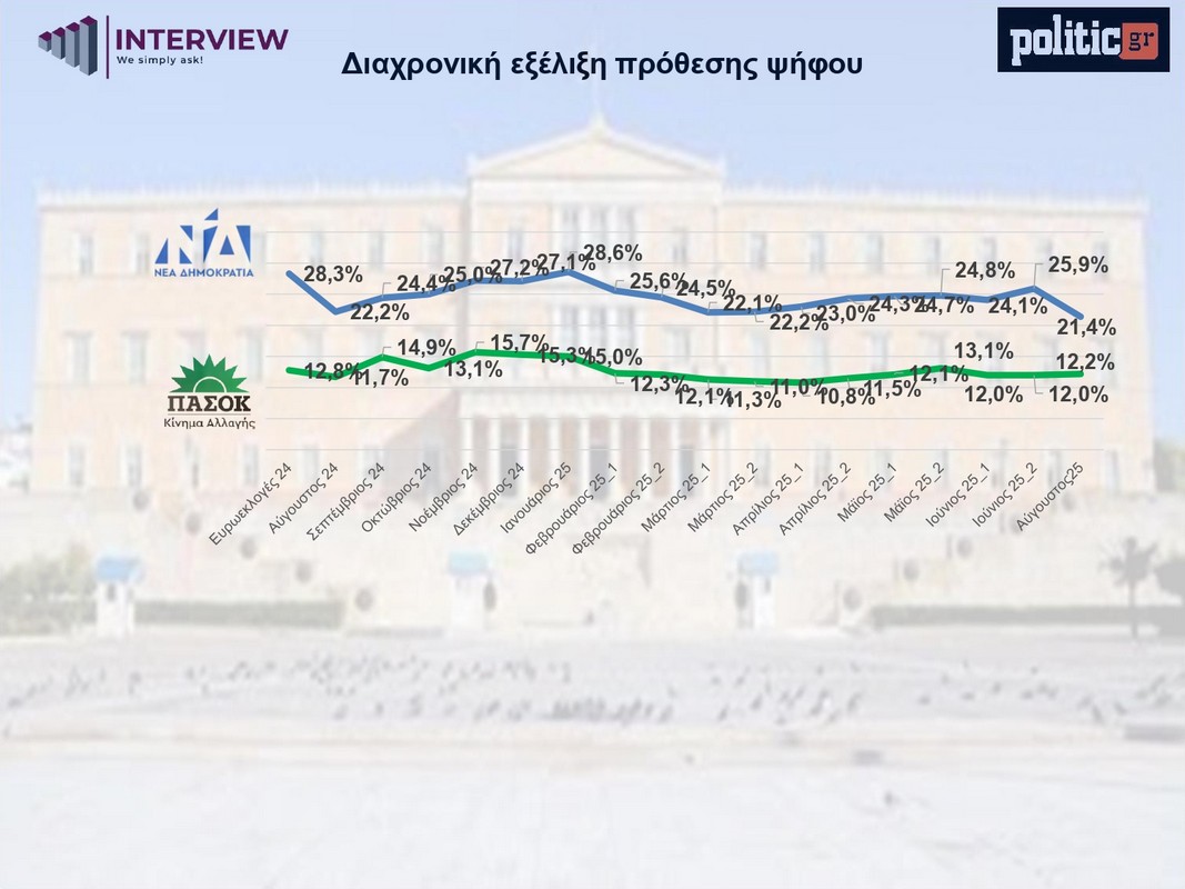 -Η Νέα Δημοκρατία υποχωρεί από το 25,9% τον Ιούνιο στο 21,4% τον Αύγουστο.