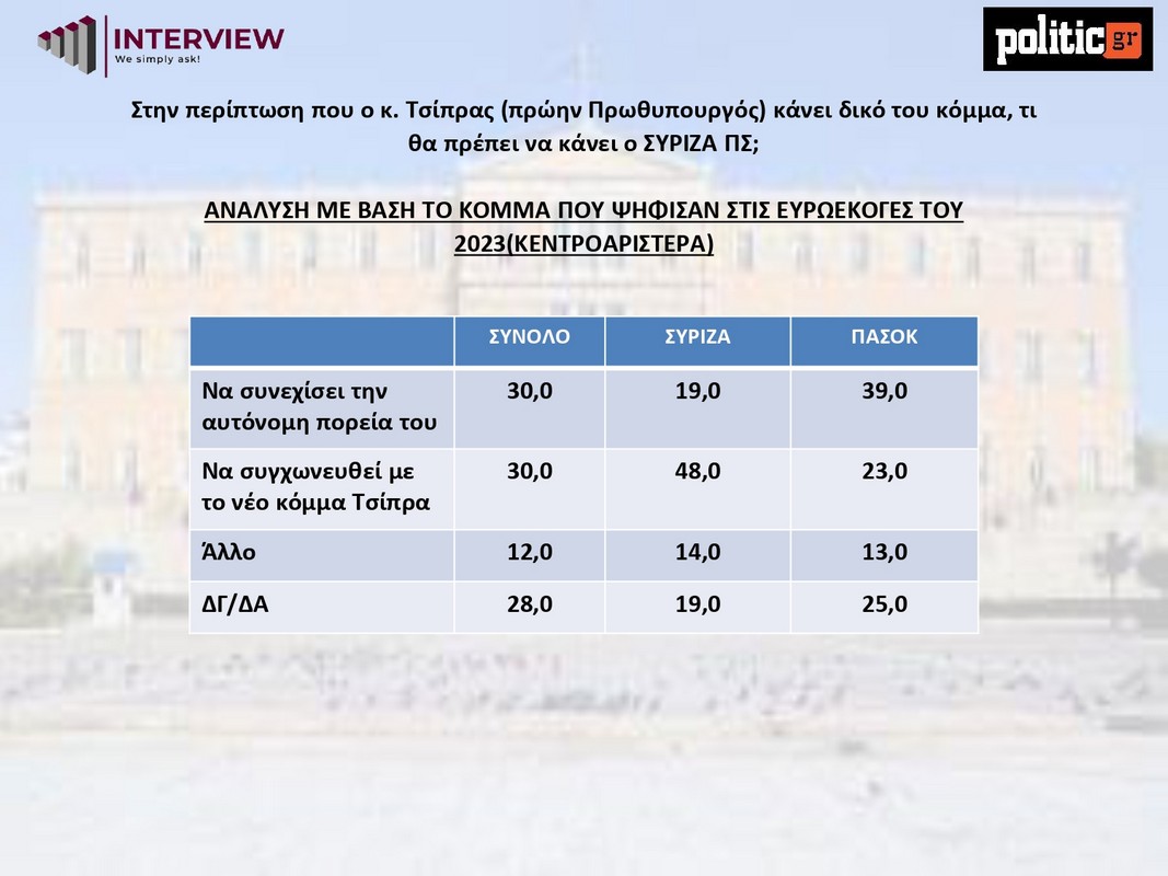 Ιδιαίτερο ενδιαφέρον συγκεντρώνει το ερώτημα για το τι θα πρέπει να πράξει ο ΣΥΡΙΖΑ σε περίπτωση που ο Αλέξης Τσίπρας προχωρήσει στην ίδρυση νέου κόμματος. Τα στοιχεία δείχνουν ισορροπία: το 30% θεωρεί ότι ο ΣΥΡΙΖΑ πρέπει να συνεχίσει την αυτόνομη πορεία του, ενώ άλλο ένα 30% προκρίνει τη συγχώνευση με τον νέο πολιτικό φορέα. Σημαντικό παραμένει το ποσοστό όσων δεν τοποθετούνται (28%), αποτυπώνοντας την αβεβαιότητα στο εσωτερικό της Κεντροαριστεράς.
