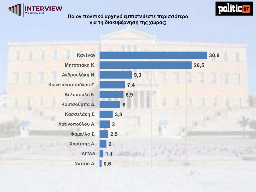Στο ερώτημα «ποιον πολιτικό αρχηγό εμπιστεύεστε περισσότερο για τη διακυβέρνηση της χώρας», τα στοιχεία του Αυγούστου καταγράφουν σημαντικές μεταβολές σε σχέση με τον Ιούνιο. Ο Κυριάκος Μητσοτάκης υποχωρεί αισθητά, από το 31,7% στο 26,5%, χάνοντας πέντε μονάδες σε δύο μήνες. Την ίδια στιγμή, η απάντηση «κανέναν» ενισχύεται και από το 29,4% ανεβαίνει στο 30,9%, κατακτώντας την πρώτη θέση. Ο Νίκος Ανδρουλάκης παραμένει σχεδόν σταθερός (10% τον Ιούνιο, 9,3% τον Αύγουστο), ενώ η Ζωή Κωνσταντοπούλου κινείται στα ίδια επίπεδα (7,3% – 7,4%). Μικρές μετατοπίσεις καταγράφουν οι υπόλοιποι αρχηγοί, χωρίς ωστόσο να δημιουργείται τάση ανατροπής.