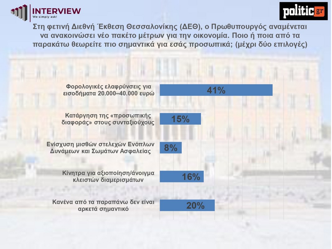 Η εικόνα επιβεβαιώνεται και στο ειδικό ερώτημα για το νέο πακέτο μέτρων που αναμένεται να ανακοινώσει ο πρωθυπουργός στη ΔΕΘ: Το 41% προκρίνει φορολογικές ελαφρύνσεις για εισοδήματα 20.000–40.000 ευρώ, με τις υπόλοιπες επιλογές να συγκεντρώνουν σαφώς χαμηλότερα ποσοστά.