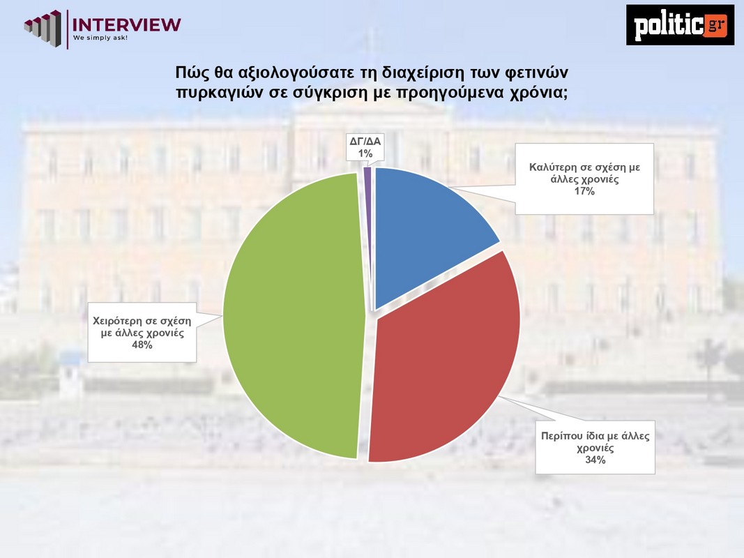 Σύμφωνα με τη μέτρηση, το 48% των πολιτών θεωρεί τη διαχείριση των φετινών πυρκαγιών χειρότερη σε σχέση με προηγούμενα χρόνια, ενώ το 34% εκτιμά ότι παρέμεινε περίπου στο ίδιο επίπεδο. Μόλις το 17% κρίνει ότι η διαχείριση ήταν καλύτερη.