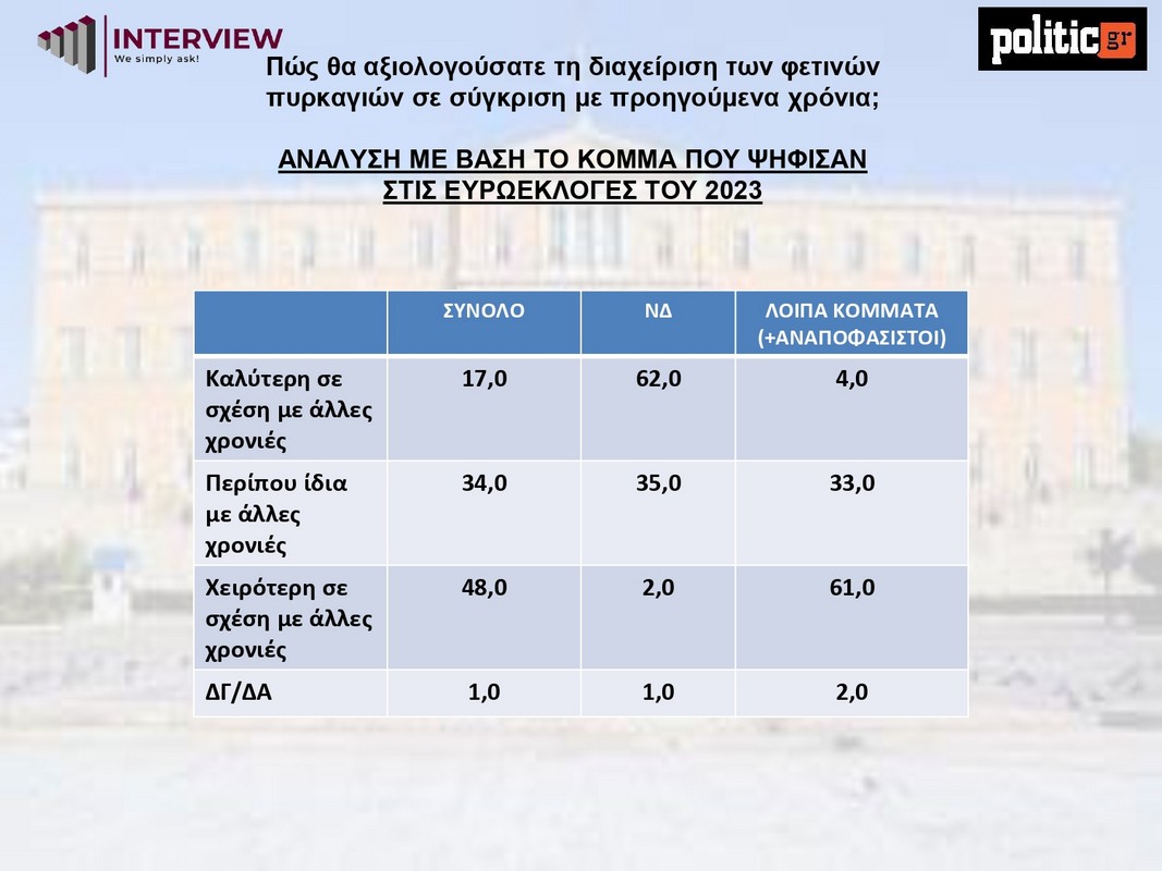 Η εικόνα διαφοροποιείται αισθητά με βάση την κομματική προτίμηση. Το 62% των ψηφοφόρων της Νέας Δημοκρατίας δηλώνει ότι η αντιμετώπιση των πυρκαγιών ήταν καλύτερη από άλλες χρονιές, την ώρα που το 61% των ψηφοφόρων των υπόλοιπων κομμάτων και των αναποφάσιστων την κρίνει χειρότερη.