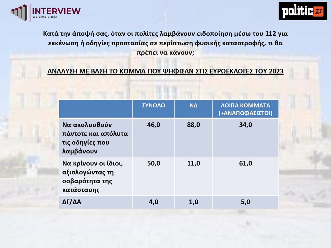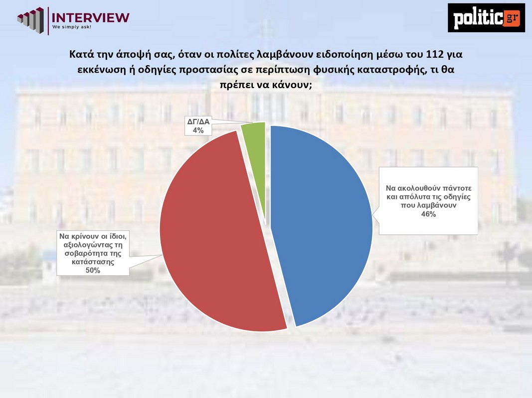 Ιδιαίτερο ενδιαφέρον παρουσιάζει το ερώτημα για τη στάση των πολιτών απέναντι στις ειδοποιήσεις εκκένωσης ή προστασίας μέσω του αριθμού 112. Η κοινωνία εμφανίζεται διχασμένη: το 50% θεωρεί ότι οι πολίτες πρέπει να κρίνουν μόνοι τους, αξιολογώντας τη σοβαρότητα της κατάστασης, ενώ το 46% απαντά ότι οι οδηγίες θα πρέπει να ακολουθούνται πάντα και απολύτως.