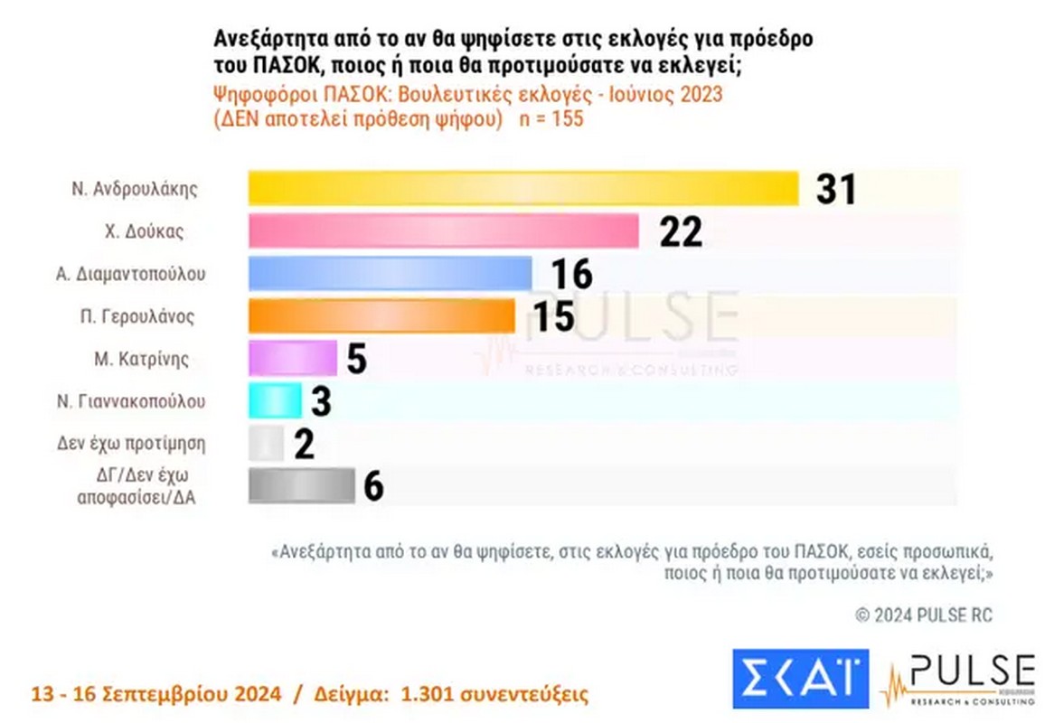 Ο κ. Ανδρουλάκης προηγείται με 9 μονάδες του Χάρη Δούκα στους ψηφοφόρους του ΠΑΣΟΚ στις εθνικές εκλογές του 2023 και με 11 μονάδες από την Άννα Διαμαντοπούλου που είναι στη δεύτερη θέση στην ομάδα των ψηφοφόρων του κόμματος στις ευρωεκλογές.