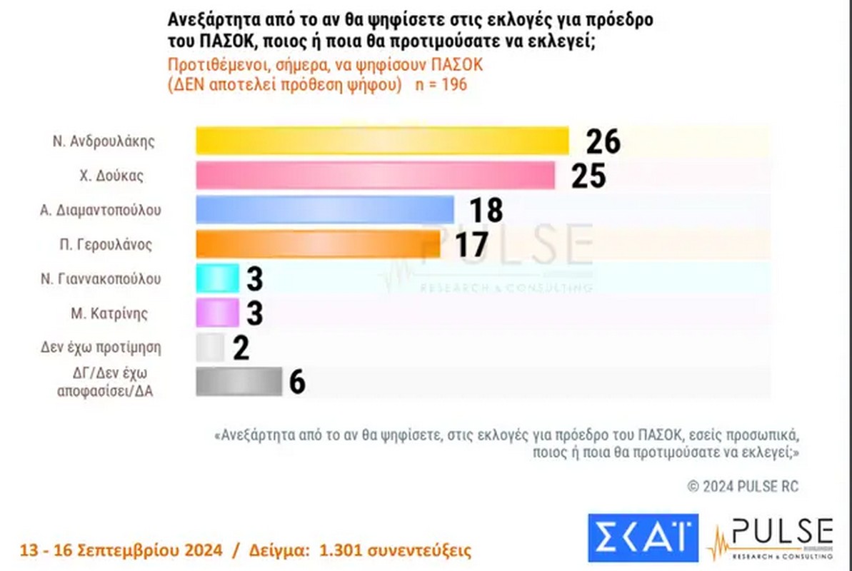 «Ντέρμπι» μεταξύ Ανδρουλάκη και Δούκα βλέπει η εταιρεία στην ομάδα των ψηφοφόρων που δηλώνουν σήμερα ψηφοφόροι του ΠΑΣΟΚ, ενώ μεταξύ εκείνων που προτίθενται να ψηφίσουν στις εσωκομματικές εκλογές, ο Νίκος Ανδρουλάκης προηγείται με 5 μονάδες, με τους Δούκα και Διαμαντοπούλου να έχουν το ίδιο ποσοστό, 22%.