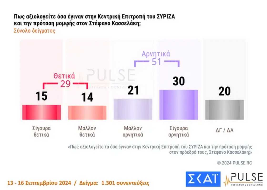 Μόλις το 31% των ψηφοφόρων του ΣΥΡΙΖΑ -το ίδιο ακριβώς ποσοστό καταγράφεται και στους ψηφοφόρους ΝΔ και ΠΑΣΟΚ- βλέπει θετικά την πρόταση μομφής κατά Κασσελάκη στην Κ.Ε του ΣΥΡΙΖΑ, ενώ σημαντικό ποσοστό της ελληνικής κοινωνίας εκφράζει ενδιαφέρον για τις εκλογές στο κόμμα. Πολύ ή αρκετά δηλώνει ότι ενδιαφέρεται το 28%.
