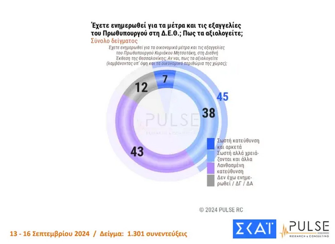 Σχεδόν ένας στους δύο ερωτηθέντες εκφράστηκε θετικά για τα μέτρα που εξαγγέλθηκαν στη ΔΕΘ, με την επισήμανση ωστόσο ότι «χρειάζονται και άλλα». Όπως σε όλες τις δημοσκοπήσεις των τελευταίων ετών, ως σημαντικότερο πρόβλημα καταγράφεται η ακρίβεια και στη συνέχεια ο οικογενειακός προϋπολογισμός.