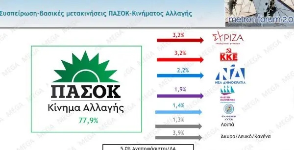 Σύμφωνα με δημοσκόπηση της Metron Analysis, η οποία παρουσιάστηκε στο κεντρικό δελτίο ειδήσεων του MEGA, το ΠΑΣΟΚ παγιώνεται στην δεύτερη θέση, με κέρδη σχεδόν δύο μονάδων μέσα στον τελευταίο μήνα, καθώς ο ΣΥΡΙΖΑ συνεχίζει την καθοδική του πορεία, με το 12,7% των ψηφοφόρων να είναι υπέρ του.