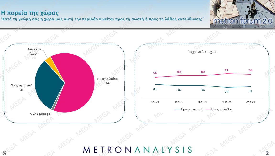 Πιο συγκεκριμένα, όσον αφορά την κατεύθυνση στην οποία κινείται η χώρα, το 64% των ερωτηθέντων απαντάει πως η Ελλάδα έχει λάθος πορεία, ενώ το 31% απαντάει πως κινείται προς τη σωστή. Ως σημαντικότερα προβλήματα για τους πολίτες καταγράφονται η ακρίβεια (33%), η οικονομία (27%), η κρίση θεσμών (7%), η εγκληματικότητα 6% και η ανεργία (5%).