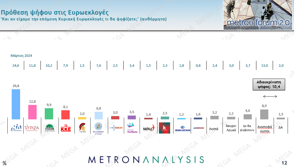Η Νέα Δημοκρατία παραμένει σταθερά πρώτη με μεγάλη διαφορά από τον δεύτερο, ΣΥΡΙΖΑ – ΠΣ, στην εκτίμηση ψήφου για τις προσεχείς Ευρωεκλογές, στη δημοσκόπηση της Metron Analysis για το MEGA.