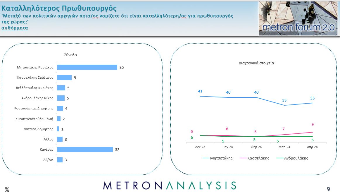 Στην καταλληλόλητα για πρωθυπουργός, ο πρωθυπουργός Κυριάκος Μητσοτάκης βρίσκεται στην πρώτη θέση με 35%, ενώ δεύτερη πιο δημοφιλής απάντηση είναι ο «κανένας» με 33%. Ακολουθούν Στέφανος Κασσελάκης (9%), Κυριάκος Βελόπουλος (5%), Νίκος Ανδρουλάκης (5%) και ο Δημήτρης Κουτσούμπας (4%).