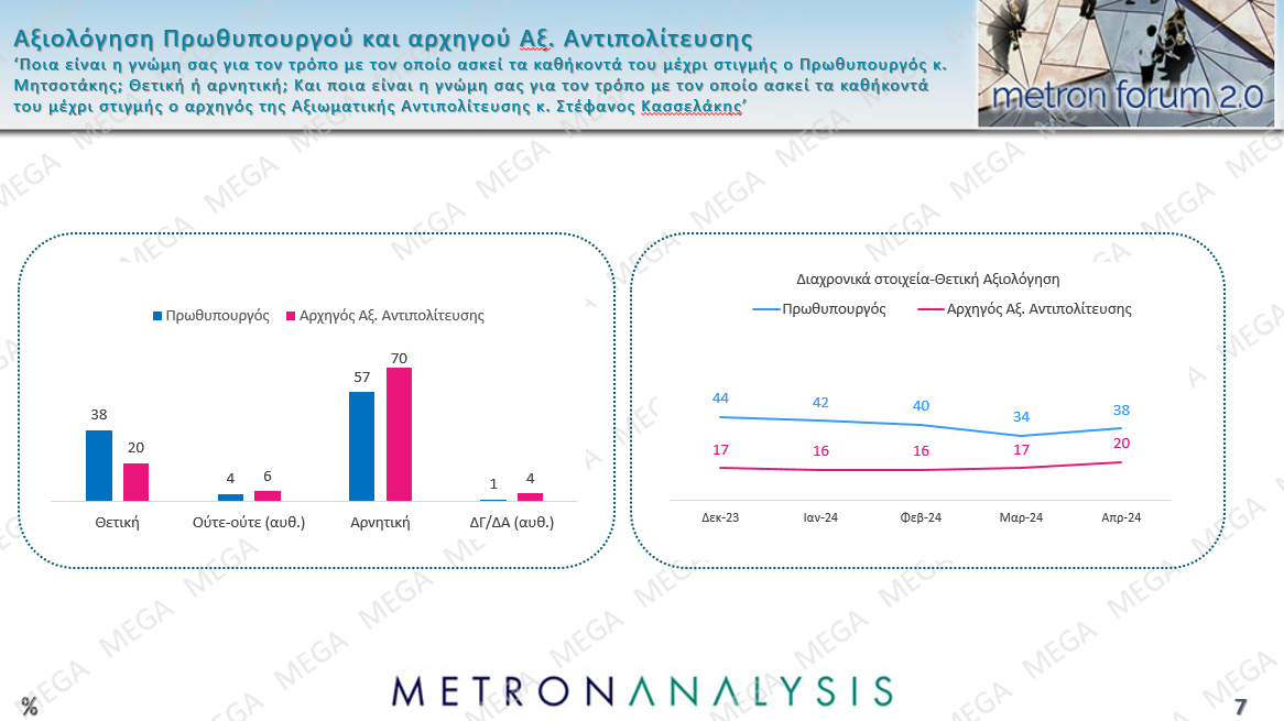 Από την άλλη πλευρά, οι χαμηλότερες επιδόσεις της εντοπίζονται στην εγκληματικότητα, την αντιμετώπιση της διαφθοράς, την αντιμετώπιση του πληθωρισμού και την αντιμετώπιση των φυσικών καταστροφών.