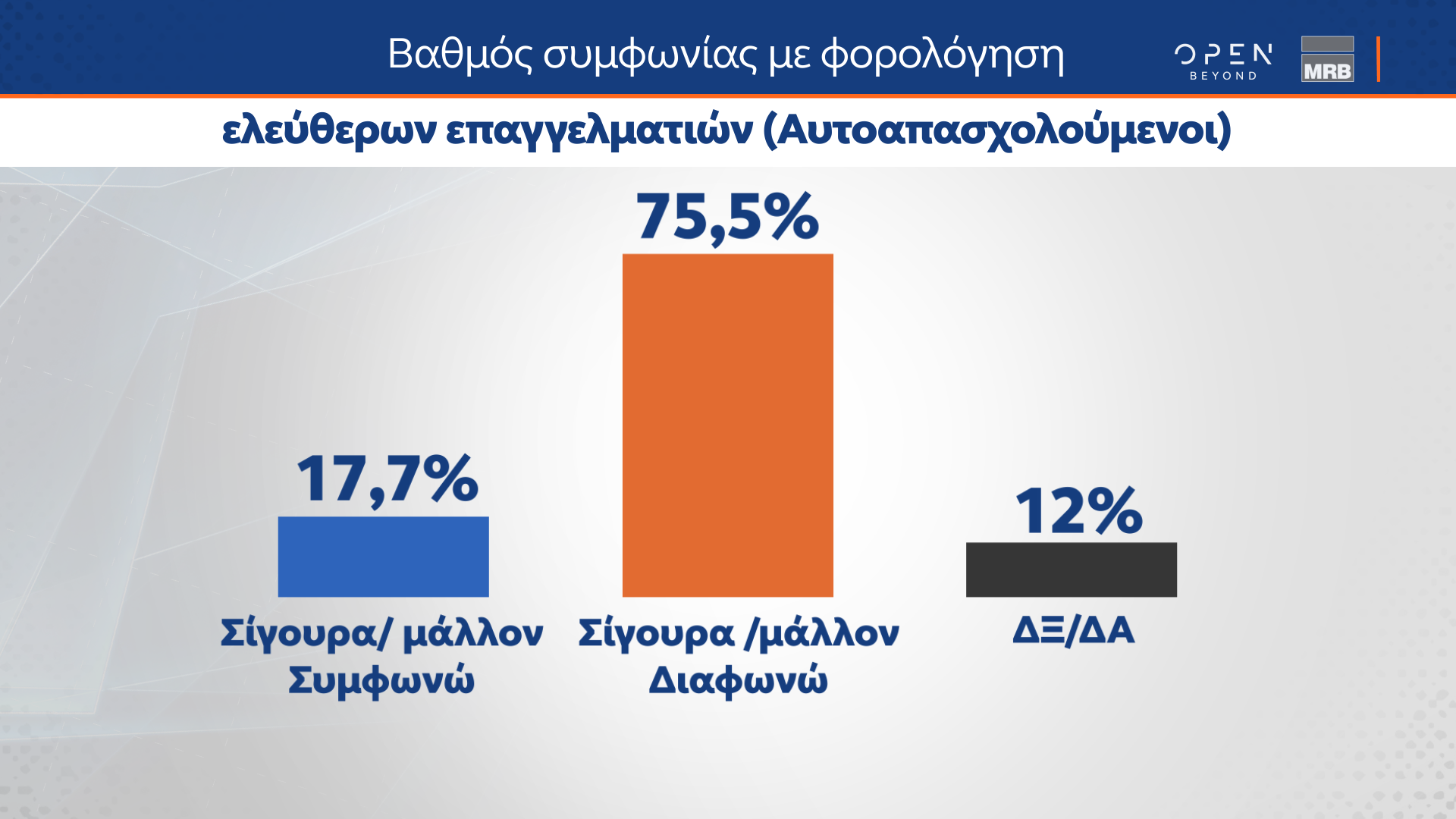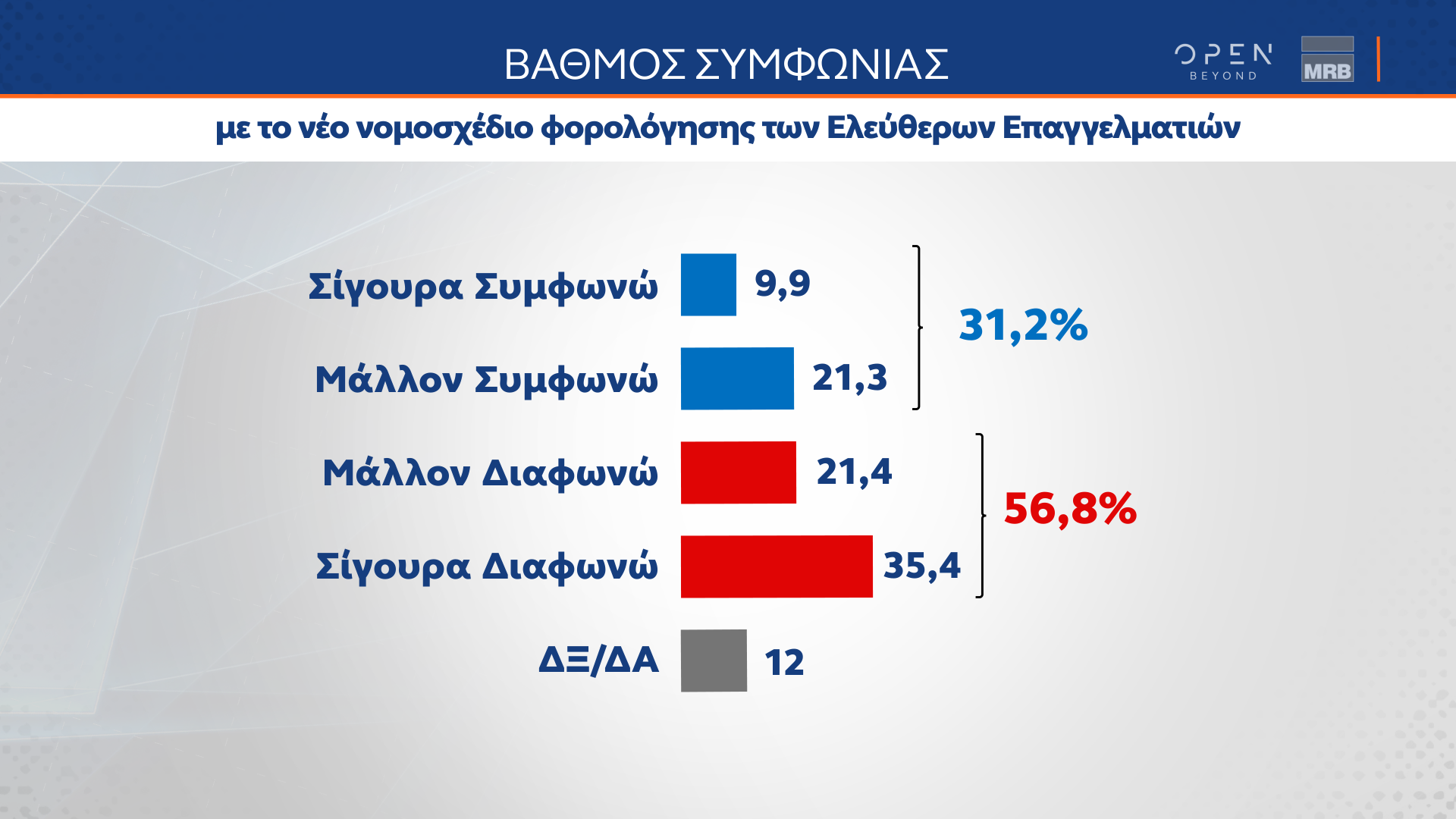 Οι συμμετέχοντες στη δημοσκόπηση κλήθηκαν να σχολιάσουν το νέο φορολογικό νομοσχέδιο. Μάλιστα, το 56,8% διαφωνεί με αυτό, ενώ το 31,2% συμφωνεί με τις διατάξεις του νόμου που ψηφίστηκε πρόσφατα και φέρνει αλλαγές κυρίως στους ελεύθερους επαγγελματίες. Ως προς τους ελεύθερους επαγγελματίες, το 75,5% διαφωνεί με το νομοσχέδιο, ενώ μόλις το 17,7% συμφωνεί.