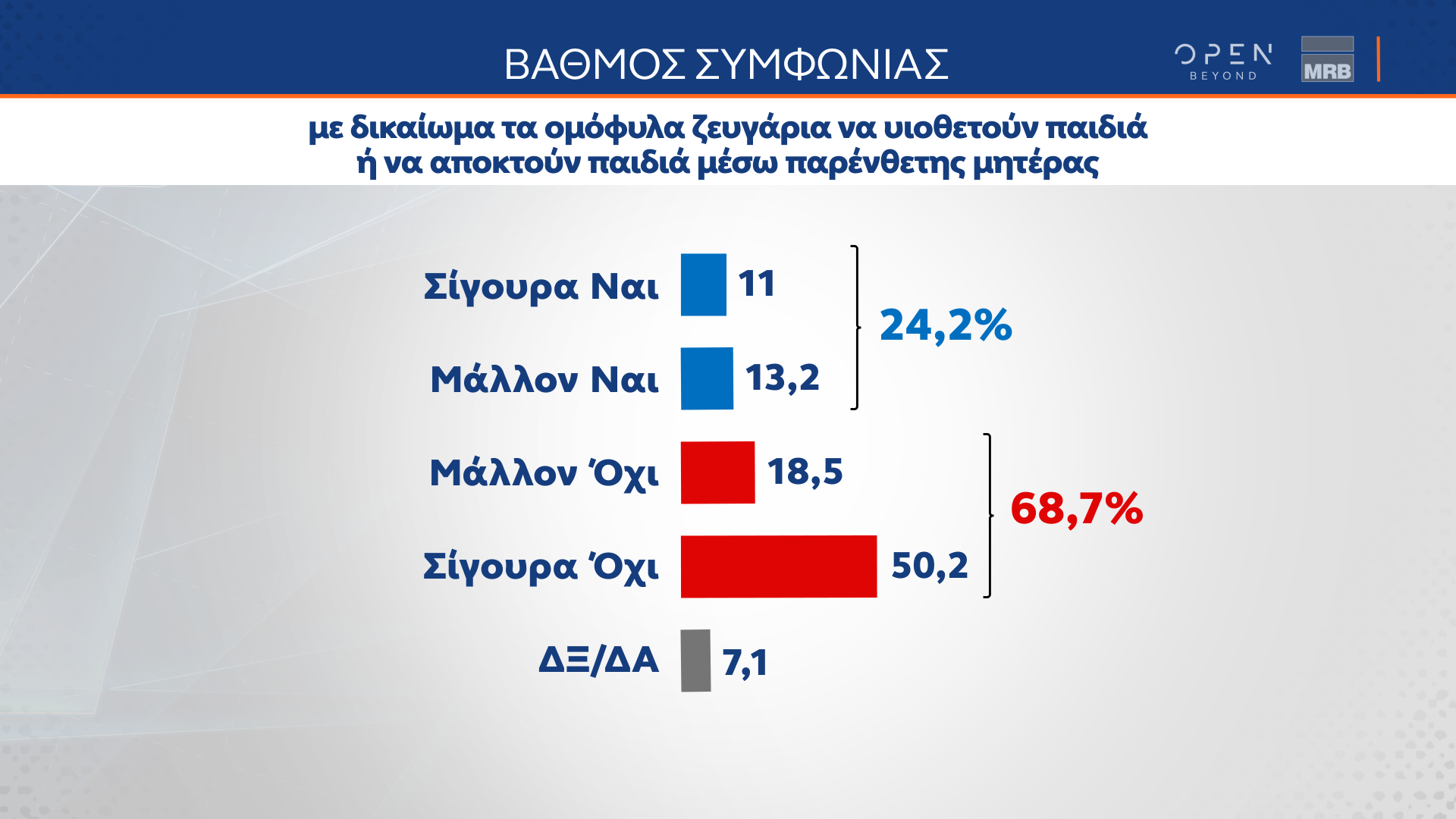 Απαντώντας σε ερώτηση για το εάν πρέπει τα ομόφυλα ζευγάρια να μπορούν να υιοθετούν παιδιά ή να αποκτούν παιδιά μέσω παρένθετης μητέρας, το 68,7% εκφράζει τη διαφωνία του, ενώ το 24,2% συμφωνεί. Πάντως, το 49,8% λέει πως θα πήγαινε σε έναν γάμο ομόφυλων ζευγαριών, ενώ το 44,2% απαντά πως δεν θα πήγαινε.