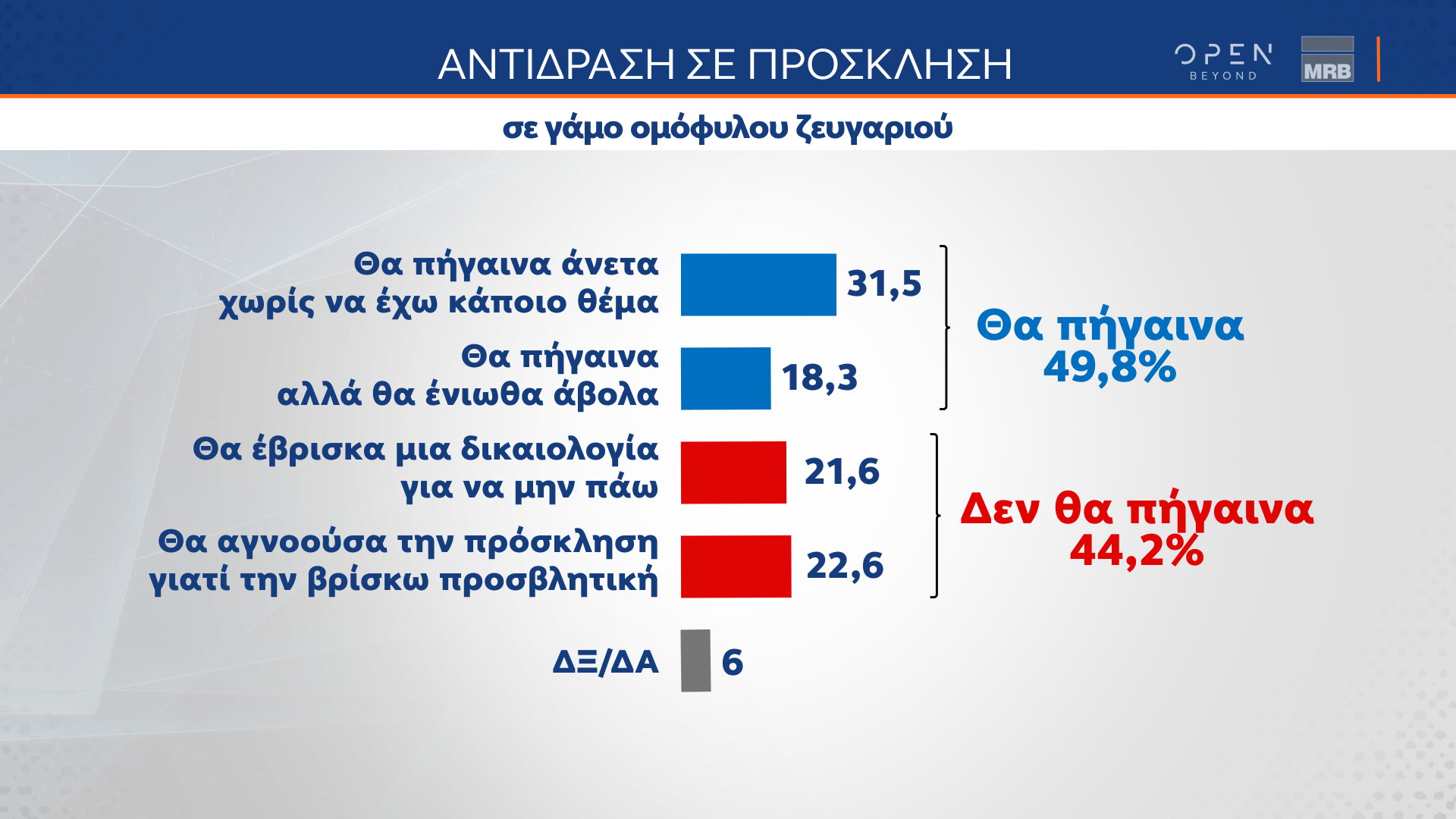 Ως προς το δικαίωμα γάμου στα ομόφυλα ζευγάρια, το 52,9% διαφωνεί, ενώ το 40,3% συμφωνεί.