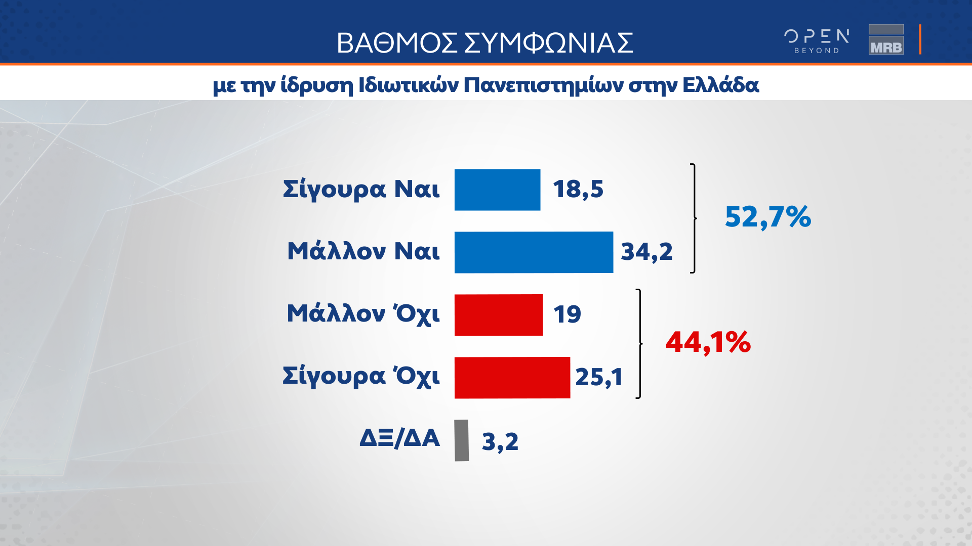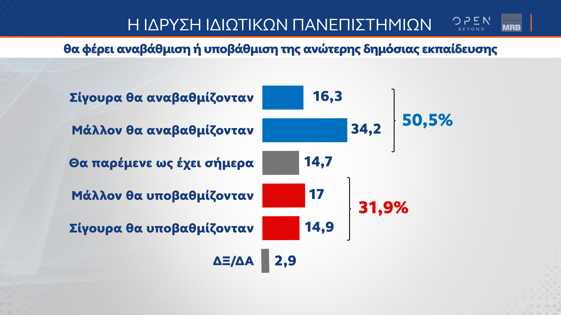 Το 52,7% συμφωνεί με την ίδρυση ιδιωτικών πανεπιστημίων στην Ελλάδα, ενώ το 44,1% εκφράζει τη διαφωνία του. Το 50,5% εκτιμά προς αυτή την κατεύθυνση πως η ίδρυση ιδιωτικών πανεπιστημίων θα αναβάθμιζε και την ανώτατη δημόσια εκπαίδευση. Στον αντίποδα, το 31,9% απαντά πως θα υποβαθμιζόταν.