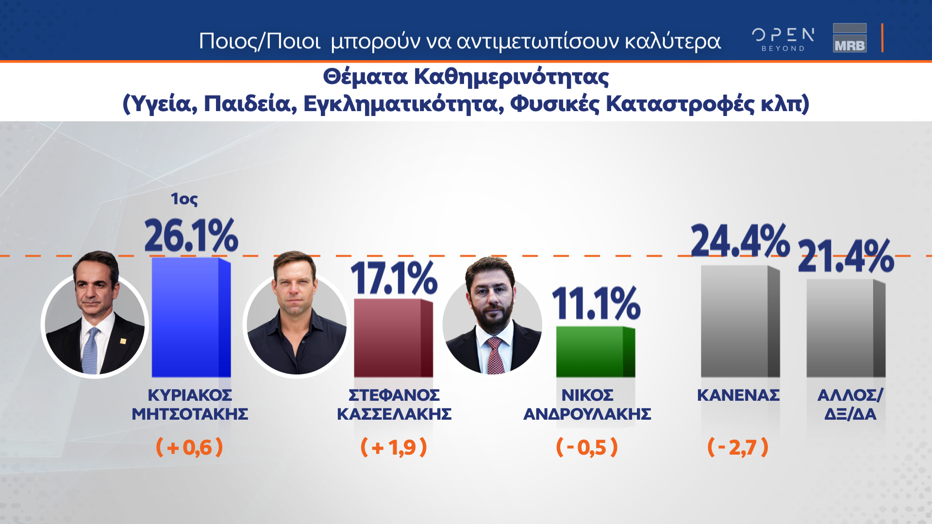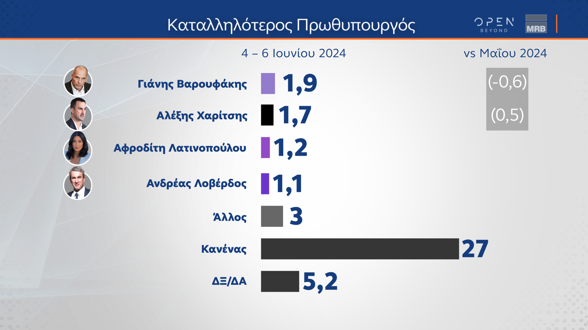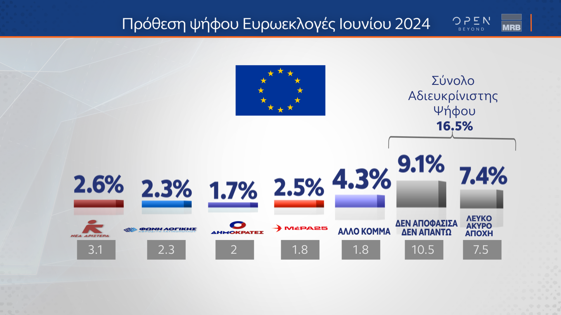 Στην πρόθεση ψήφου, η ΝΔ λαμβάνει 26,3% , ο ΣΥΡΙΖΑ 13,4%, το ΠΑΣΟΚ-ΚΙΝΑΛ 10,4%, το ΚΚΕ , η Ελληνική Λύση , η Νίκη , η Πλεύση Ελευθερίας , η Νέα Αριστερά 2,6% και 16,5% η αδιευκρίνιστη ψήφος