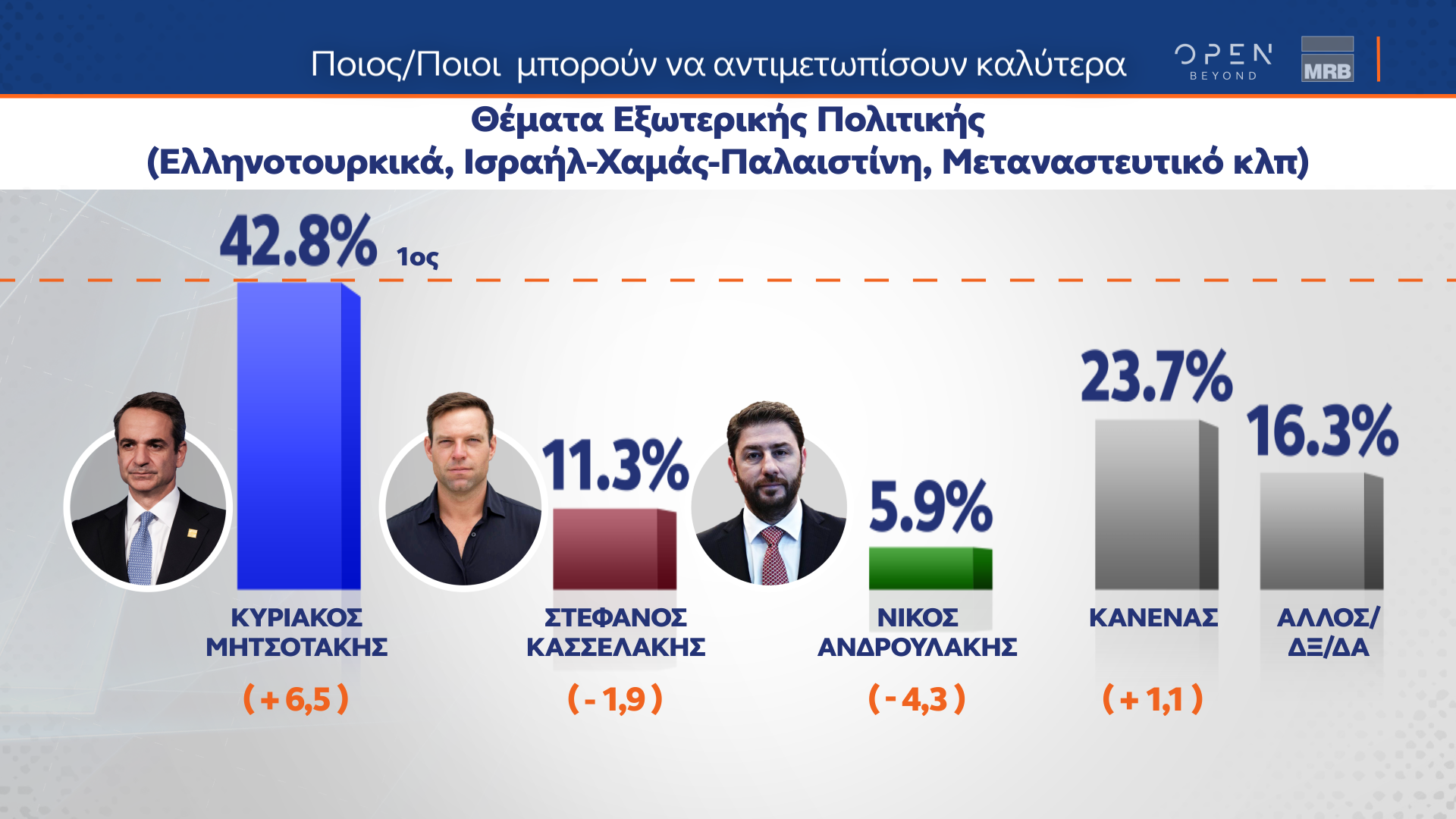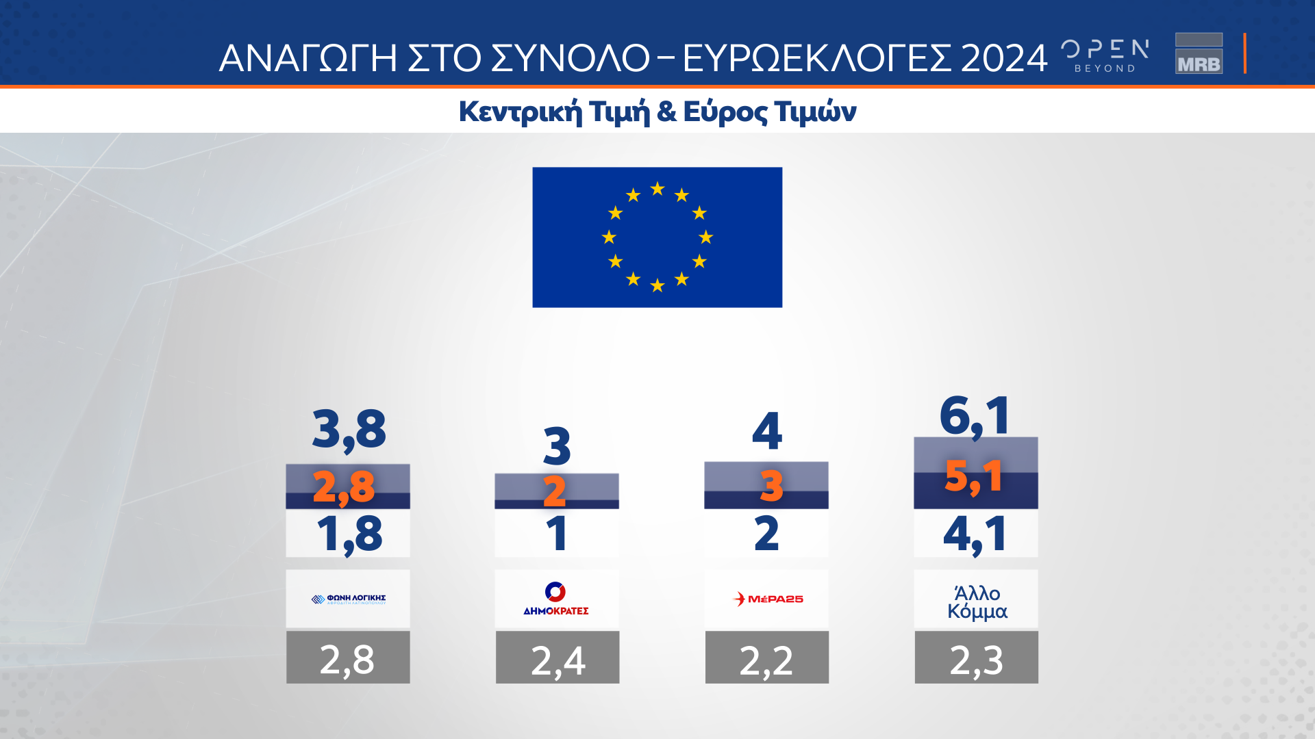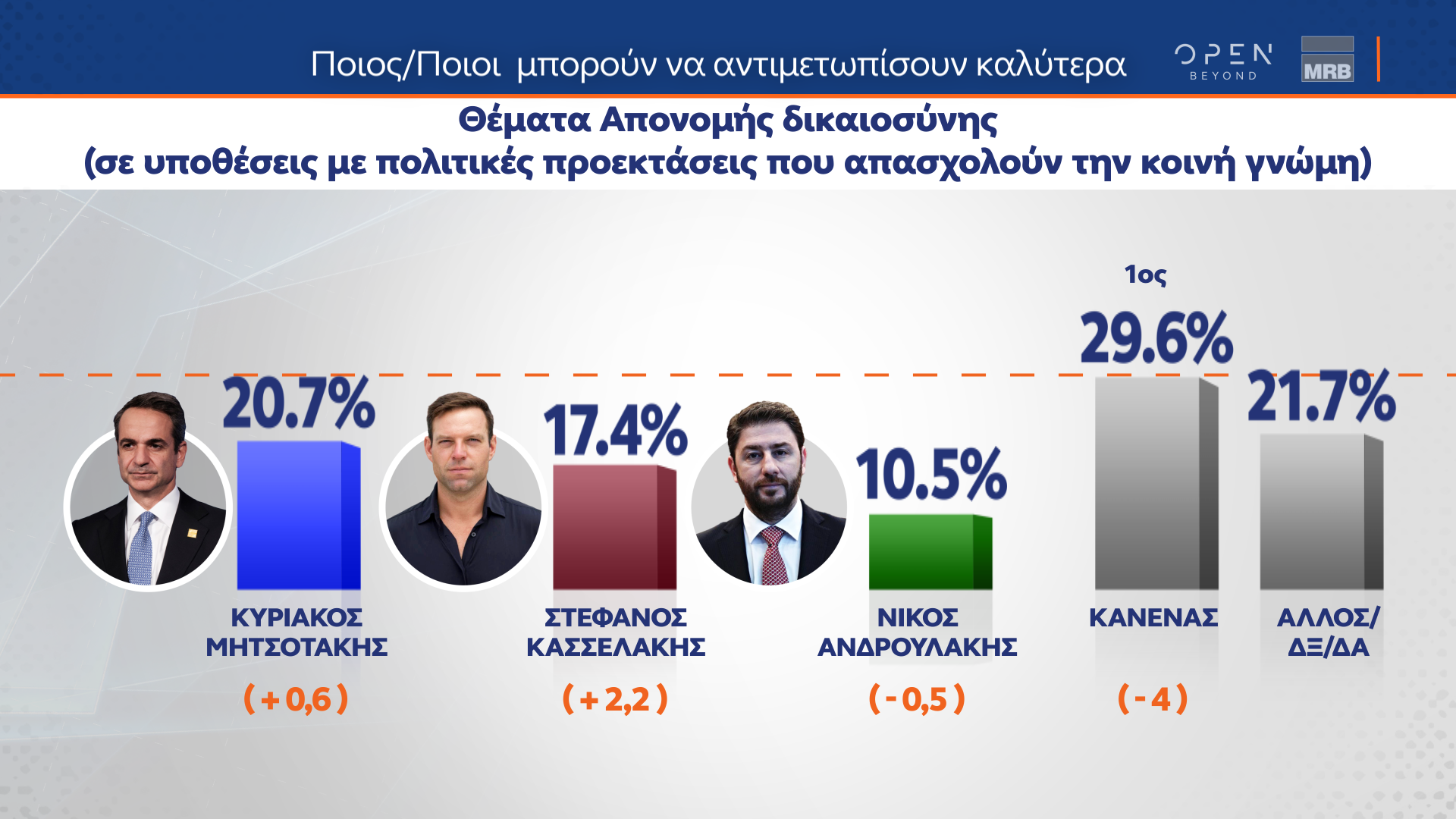 Στην πρόθεση ψήφου, η ΝΔ λαμβάνει 26,3% , ο ΣΥΡΙΖΑ 13,4%, το ΠΑΣΟΚ-ΚΙΝΑΛ 10,4%, το ΚΚΕ , η Ελληνική Λύση , η Νίκη , η Πλεύση Ελευθερίας , η Νέα Αριστερά 2,6% και 16,5% η αδιευκρίνιστη ψήφος