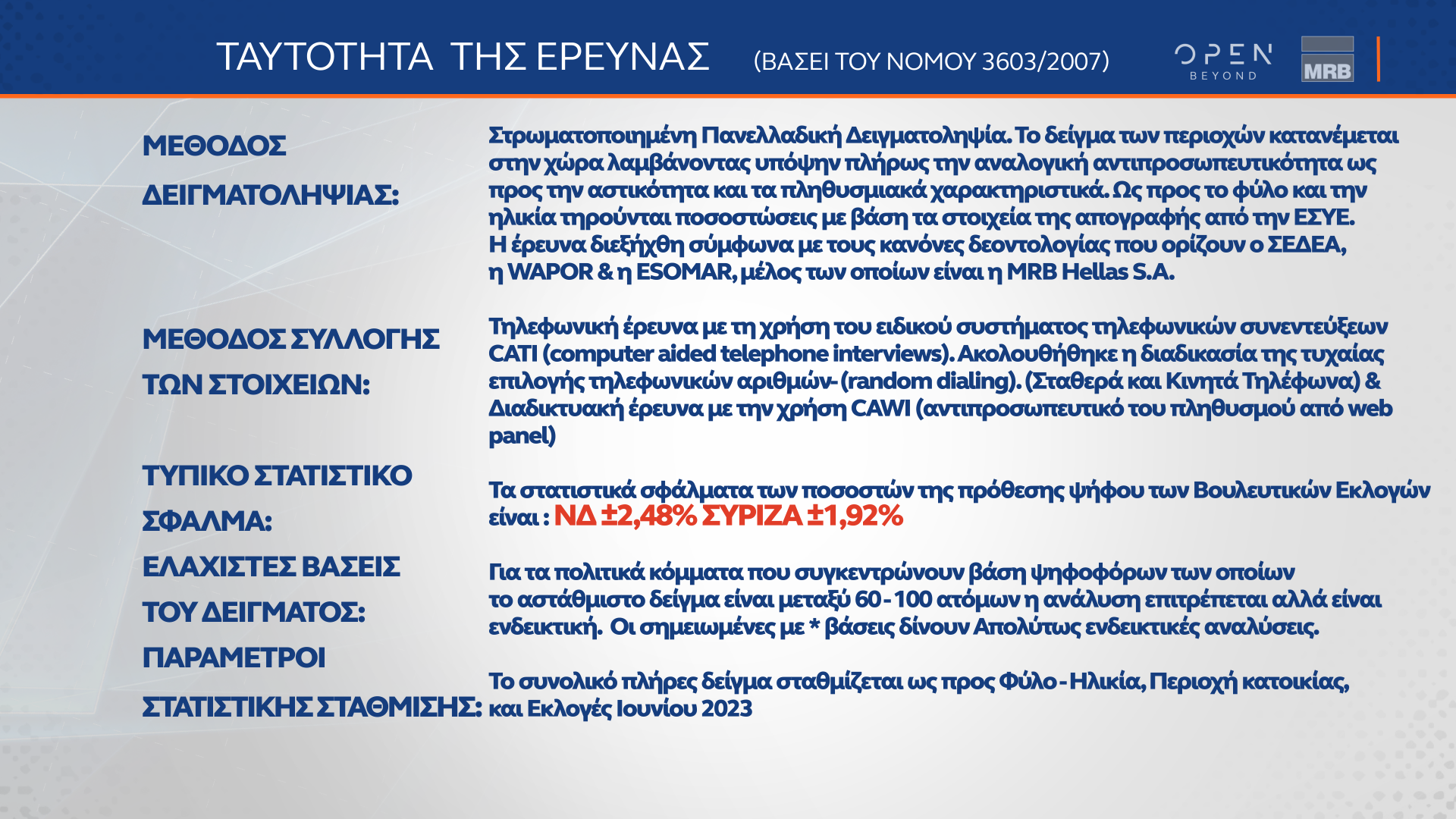 Σταθερό παραμένει το προβάδισμα της ΝΔ έναντι του ΣΥΡΙΖΑ, όπως προκύπτει από τη δημοσκόπηση της MRB που παρουσιάστηκε στο κεντρικό δελτίο ειδήσεων του OPEN.