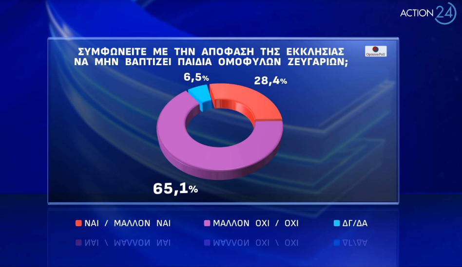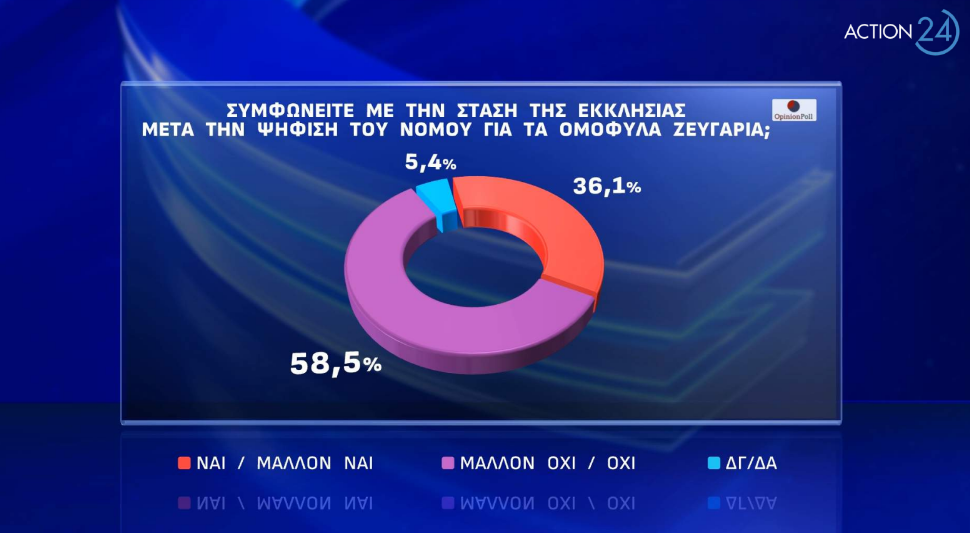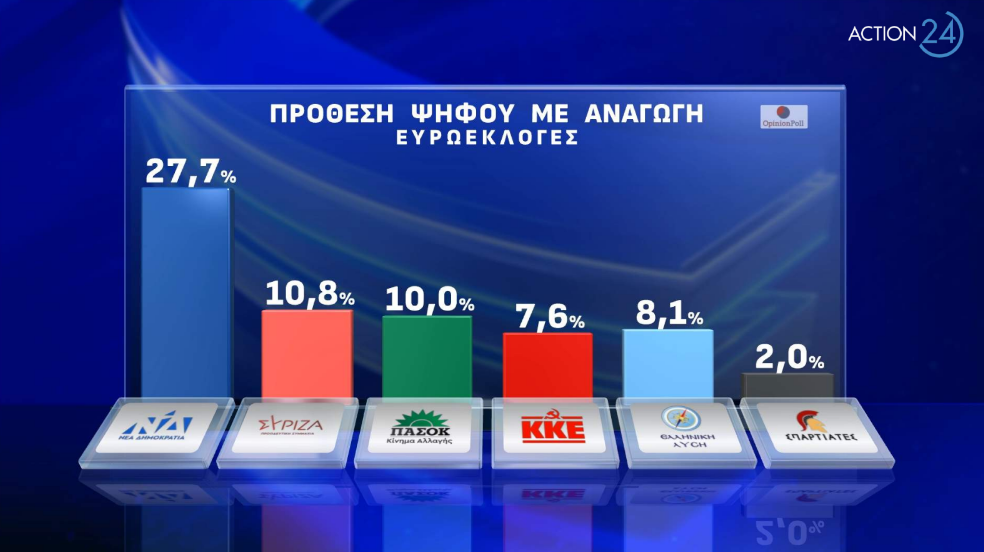 Πρώτη και με διαφορά 21 μονάδων από το δεύτερο κόμμα δείχνει η δημοσκόπηση της Opinion Poll για λογαριασμό του Action24. Ο ΣΥΡΙΖΑ σταθεροποιείται στην δεύτερη θέση με σχεδόν μία μονάδα διαφορά από το τρίτο ΠΑΣΟΚ.