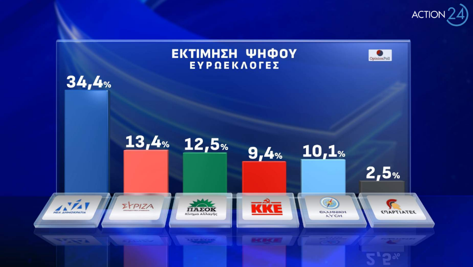 Στην εκτίμηση ψήφου ενόψει ευρωεκλογών, η ΝΔ συγκεντρώνει ποσοστό 34,4%, με μια διαφορά 21 ποσοστιαίων μονάδων από τον δεύτερο ΣΥΡΙΖΑ ο οποίος καταγράφει ποσοστό 13,4%. Τρίτο το ΠΑΣΟΚ με 12,5% και ακολουθεί η Ελληνική Λύση με 10,1%, το ΚΚΕ με 9,4%. η Νίκη με 4,3%. Μια ανάσα από το όριο εισόδου του στη Βουλή είναι το κόμμα «Δημοκράτες» του Ανδρέα Λοβέρδου (2,9%), όπως και η Πλεύση Ελευθερίας.