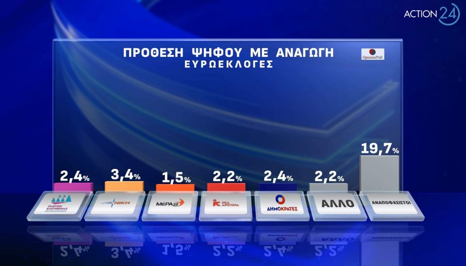 Στην πρόθεση ψήφου με αναγωγή, η ΝΔ είναι μπροστά με 27,7%, ο ΣΥΡΙΖΑ δεύτερος με 10,8%, το ΠΑΣΟΚ τρίτο με 10%, η Ελληνική Λύση τέταρτη με 8,1% και το ΚΚΕ πέμπτο με 7,6%. Δημοκράτες και Πλεύση κινούνται στο 2,4% ενώ οι αναποφάσιστοι είναι στο 19,7%.