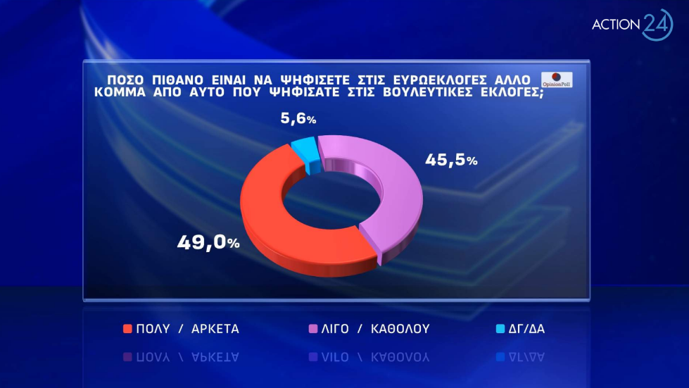 Σχεδόν ένας στους δύο (ποσοστό 49%) δηλώνει ότι είναι πολύ πιθανό να ψηφίσει άλλο κόμμα από εκείνο που ψήφισε στις βουλευτικές εκλογές, ενώ το 45,5% δηλώνει ότι είναι λίγο ή καθόλου πιθανό.