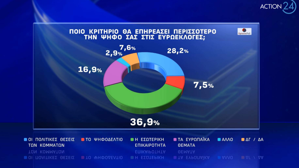 Το κριτήριο που θα επηρεάσει την ψήφο των ευρωεκλογών είναι κατά μείζονα λόγο η εσωτερική επικαιρότητα (36,9%), οι πολιτικές θέσεις των κομμάτων (28,2%), τα ευρωπαϊκά θέματα (16,9%).