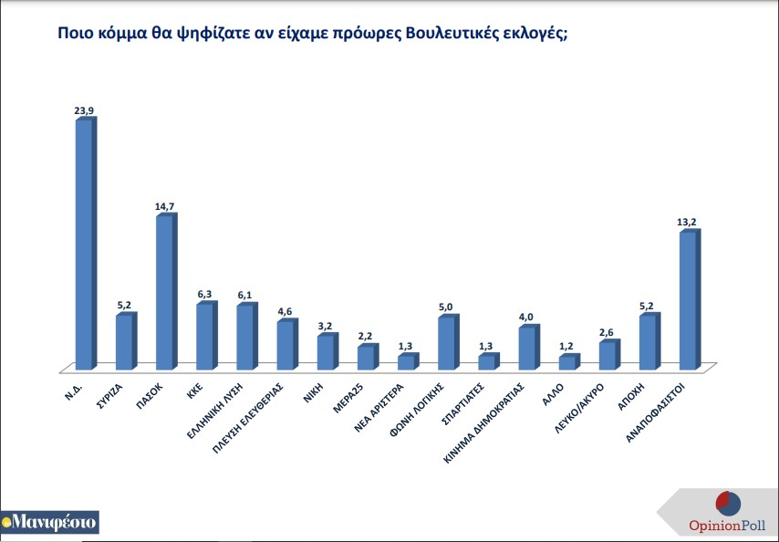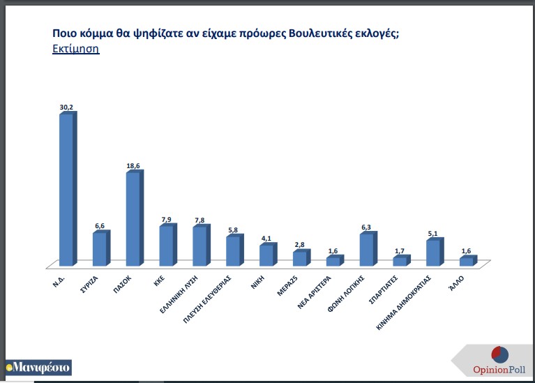 Νέα δημοσκόπηση Opinion Poll με ξεκάθαρο δίπολο ΝΔ – ΠΑΣΟΚ – Εννιακομματική η Βουλή