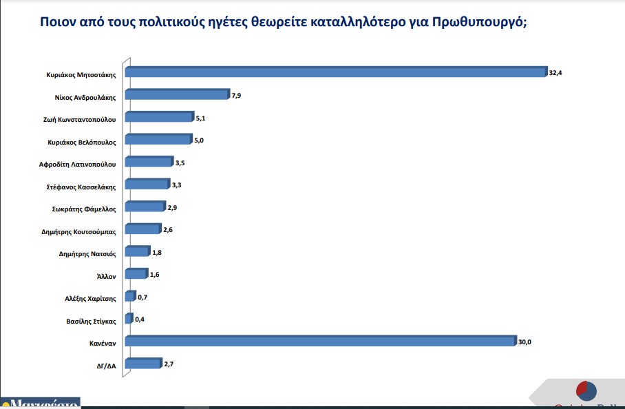 Στην καταλληλότητα για πρωθυπουργός ο Κ. Μητσοτάκης εμφανίζει πολύ μεγάλη διαφορά υπέρ του συγκεντρώνοντας το 32.4% των προτιμήσεων και μάλιστα με τετραπλάσια διαφορά του δεύτερου Ν. Ανδρουλάκη με 7.9%. Ακολουθούν : Ζωή Κωνσταντοπούλου με 5.1%, ο Κ. Βελόπουλος με 5%, η Α. Λατινοπούλου με 3.5%, ο Σ. Κασσελάκης με 3.3%, ο Σ. Φάμελλος με 2.9% κ.λ.π Το 30% επιλέγει τον Κανένα.