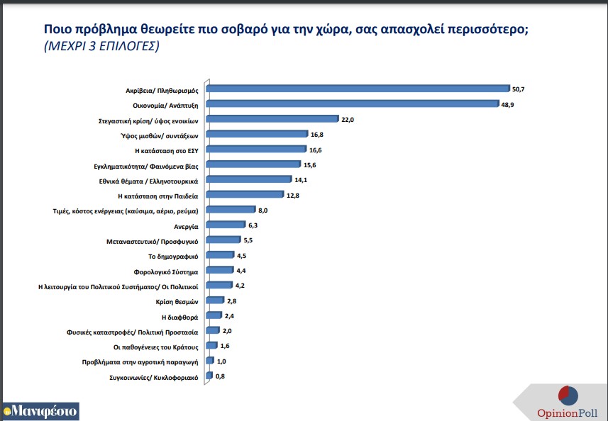 Ως κορυφαίο πρόβλημα εμφανίζεται όπως σταθερά γίνεται τα τελευταία χρόνια η ακρίβεια με 50.7%. Είναι ιδιαίτερα χαρακτηριστικό όμως ότι τα τέσσερα πρώτα προβλήματα σύμφωνα με την γνώμη των πολιτών έχουν συνάφεια και αφορούν σε οικονομικά θέματα: Ακρίβεια 50.7%, Οικονομία 48.9%, στεγαστική κρίση / ύψος ενοικίων 22%, και το ύψος μισθών/ συντάξεων με 16.8% , εύρημα που αναδεικνύει την ένταση του οικονομικού προβλήματος.