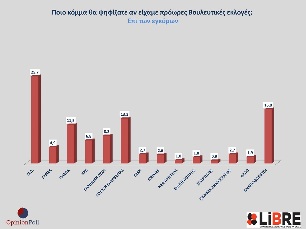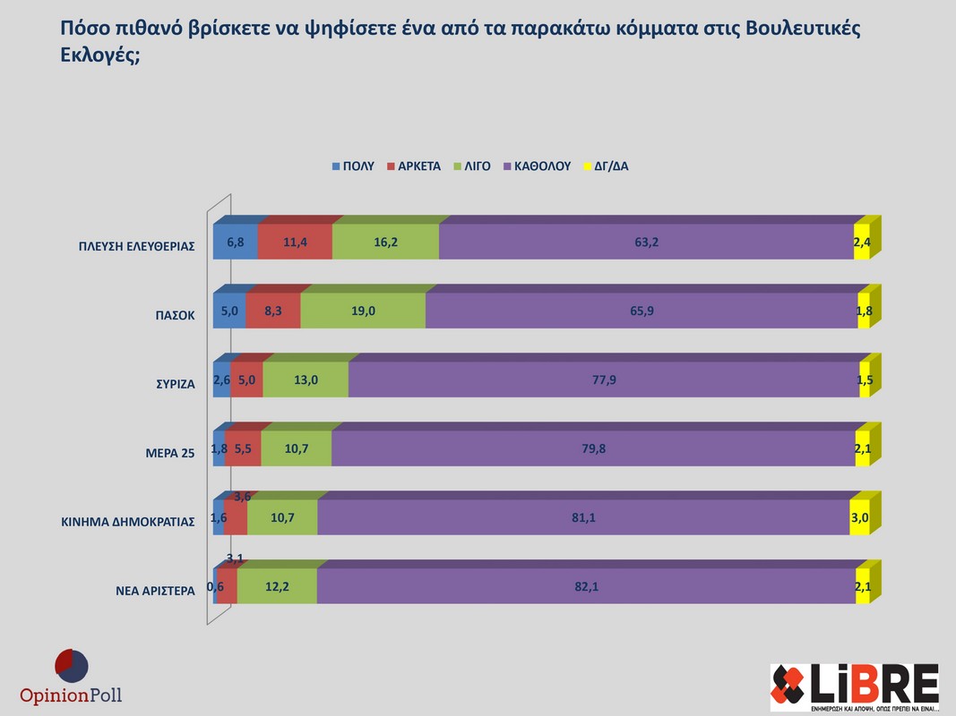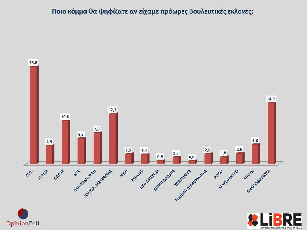 Στην Πρόθεση ψήφου με όλες τις απαντήσεις, οι επιδόσεις είναι: Ν.Δ 23.8%, ΠΛΕΥΣΗ ΕΛΕΥΘΕΡΙΑΣ 12.3%, ΠΑΣΟΚ 10.6%, ΕΛΛΗΝΙΚΗ ΛΥΣΗ 7.6% , Κ.Κ.Ε 6.3%, ΣΥΡΙΖΑ 4.5%, ΝΙΚΗ 2.5%, ΚΙΝΗΜΑ ΔΗΜΟΚΡΑΤΙΑΣ 2.5%, ΜΕΡΑ 25 2.4% , ΦΩΝΗ ΛΟΓΙΚΗΣ 1.7%, ΝΕΑ ΑΡΙΣΤΕΡΑ 0.9%, ΣΠΑΡΤΙΑΤΕΣ 0.8%, ΑΛΛΟ 1.8%, ΛΕΥΚΟ/ ΑΚΥΡΟ 2.6%, ΑΠΟΧΗ 4.8%. Αναποφάσιστοι 14.9%.