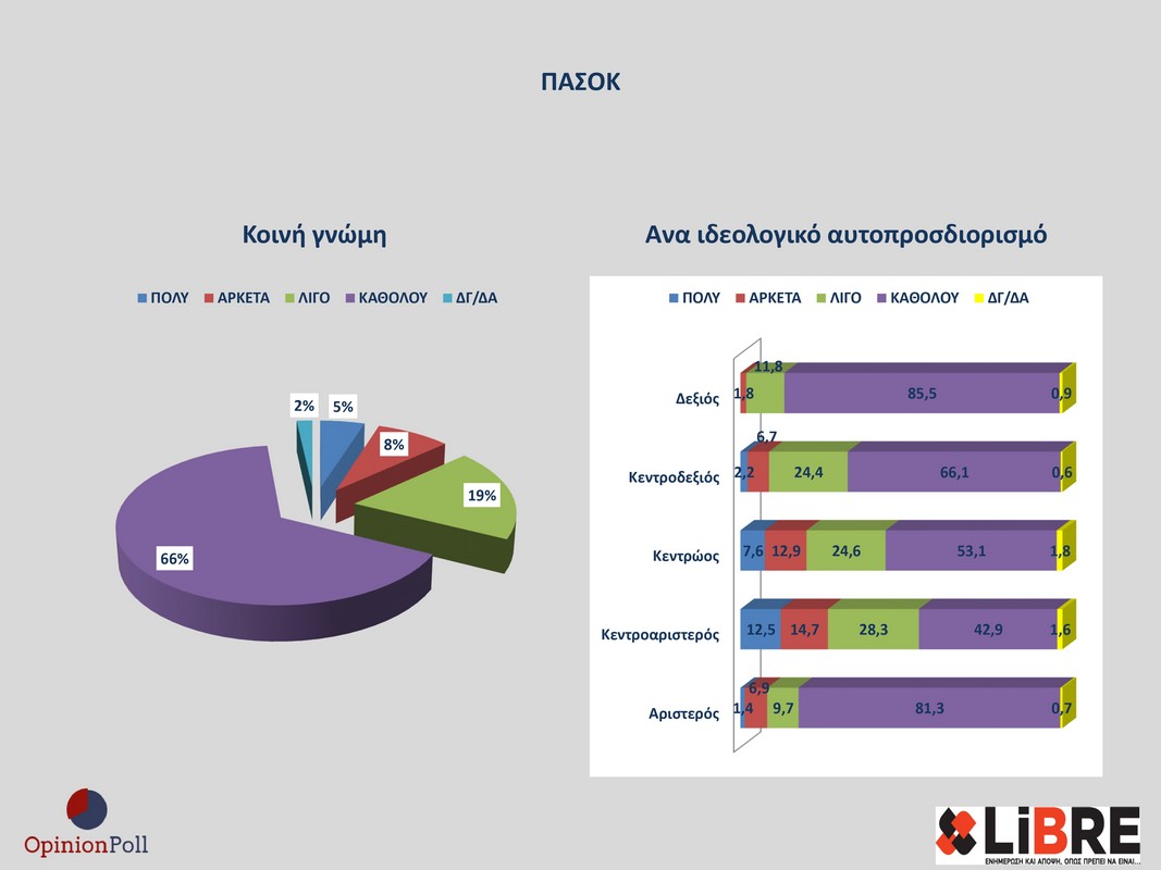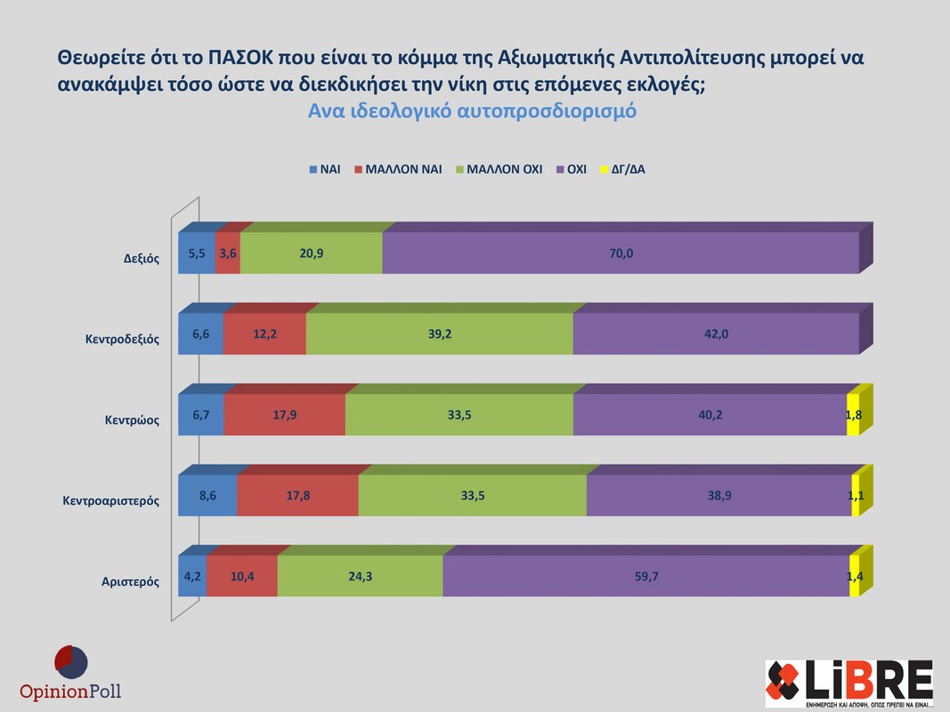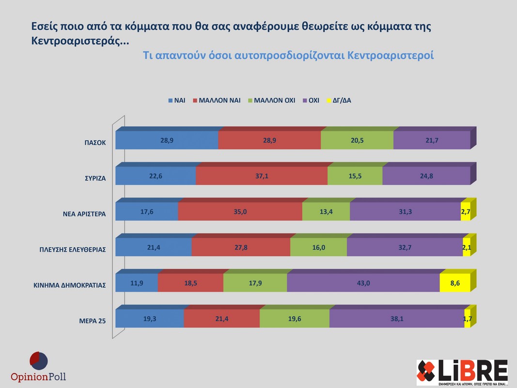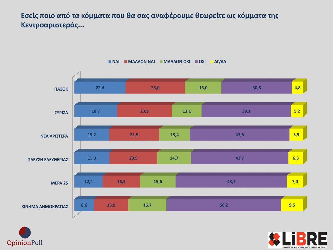 Είναι χαρακτηριστικός ο μικρός βαθμός ικανοποίησης από την αντιπολιτευτική τακτική τους ενώ σε σχέση με το ποια κόμματα θεωρεί ως κεντροαριστερά η κοινή γνώμη “ανέδειξε” ως “νικητή” το ΠΑΣΟΚ με ποσοστό 48.4% ενώ ακολουθεί ο ΣΥΡΙΖΑ με 42.6%.