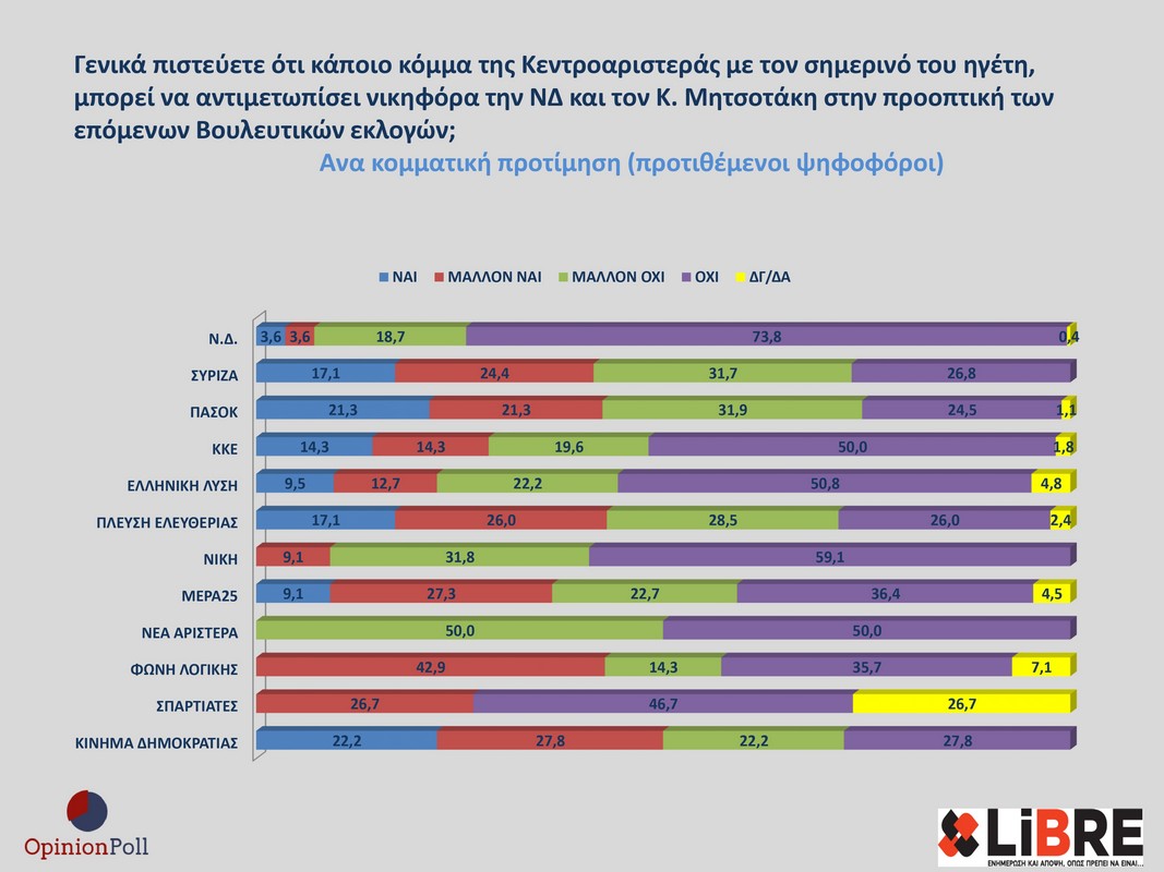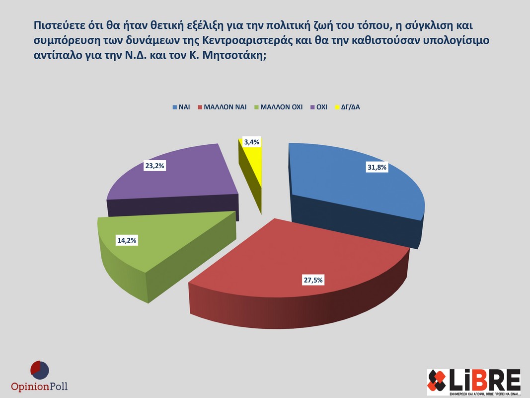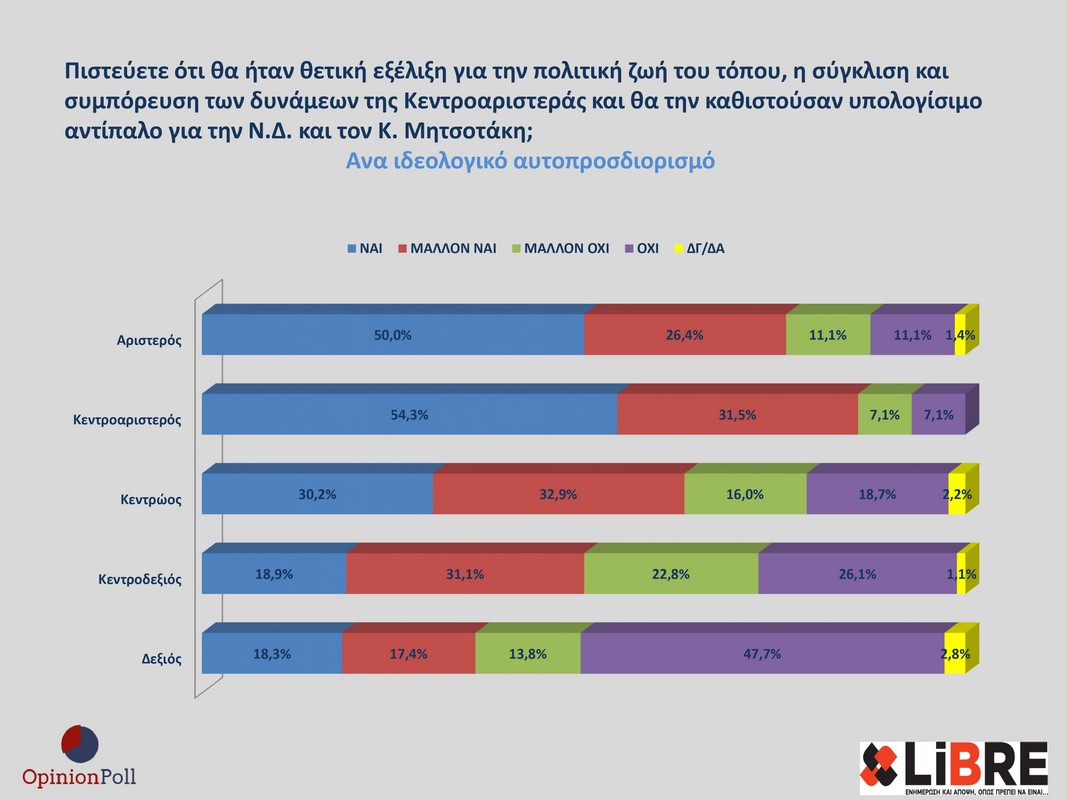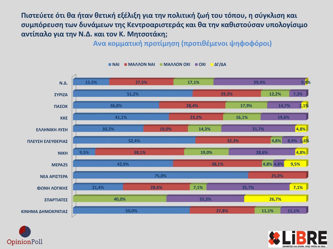 Ωστόσο, το 59.3% θεωρεί θετική εξέλιξη μια σύγκλιση των δυνάμεων της κεντροαριστεράς και πιστεύουν ότι θα την καθιστούσαν υπολογίσιμο αντίπαλο στην Ν.Δ. Αντίθετη άποψη έχει το 37.4%.
