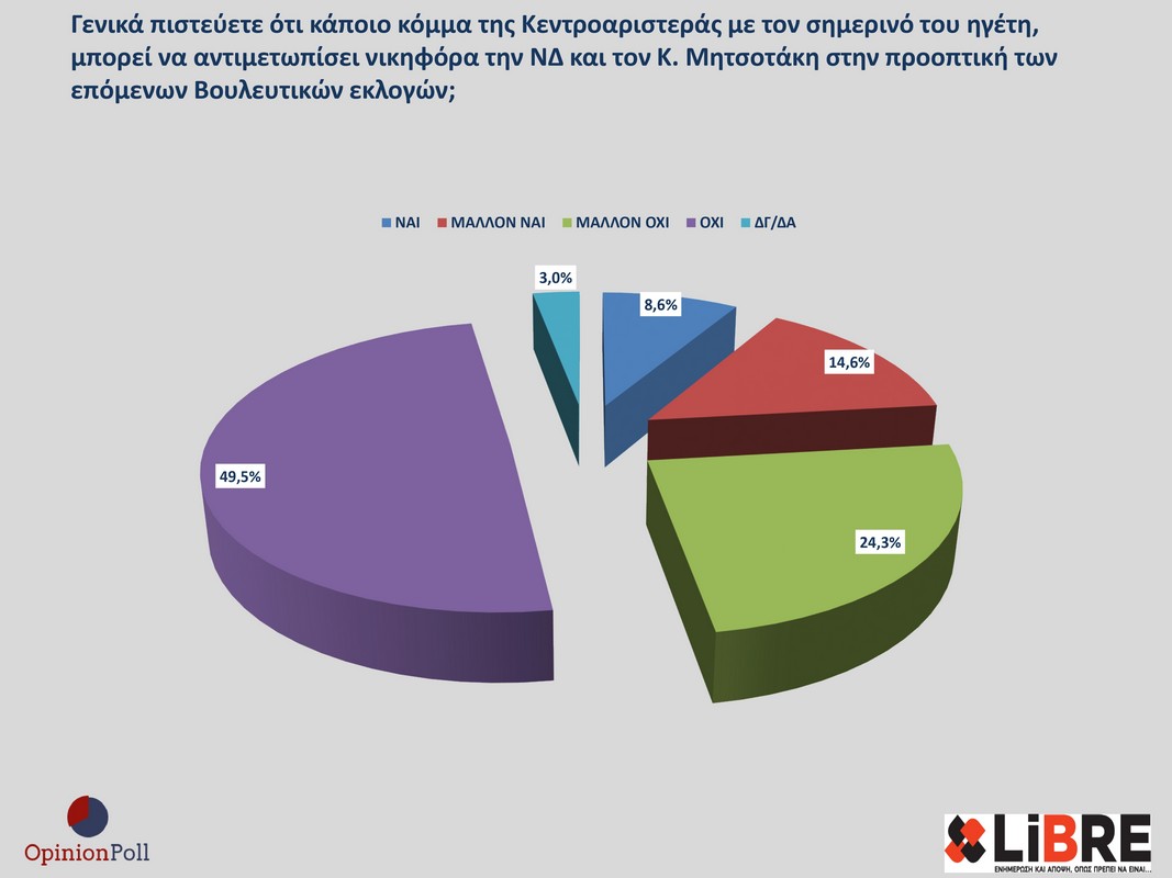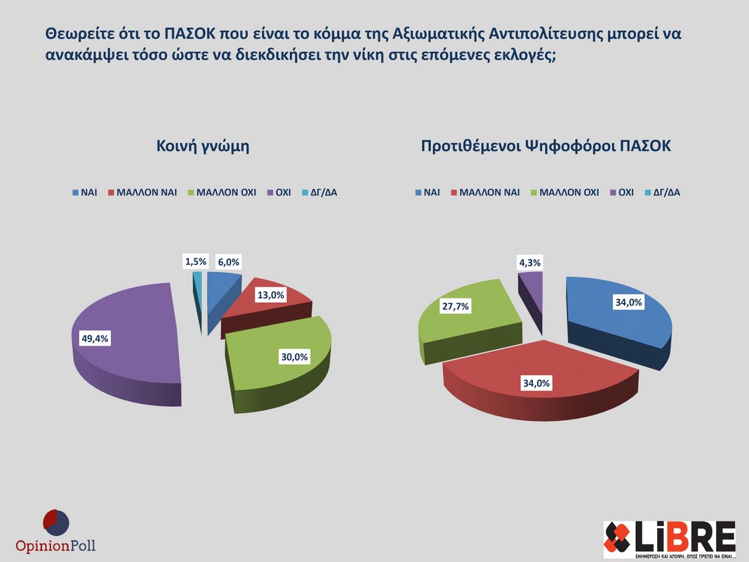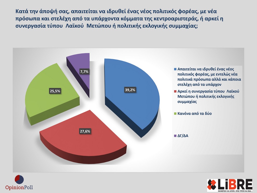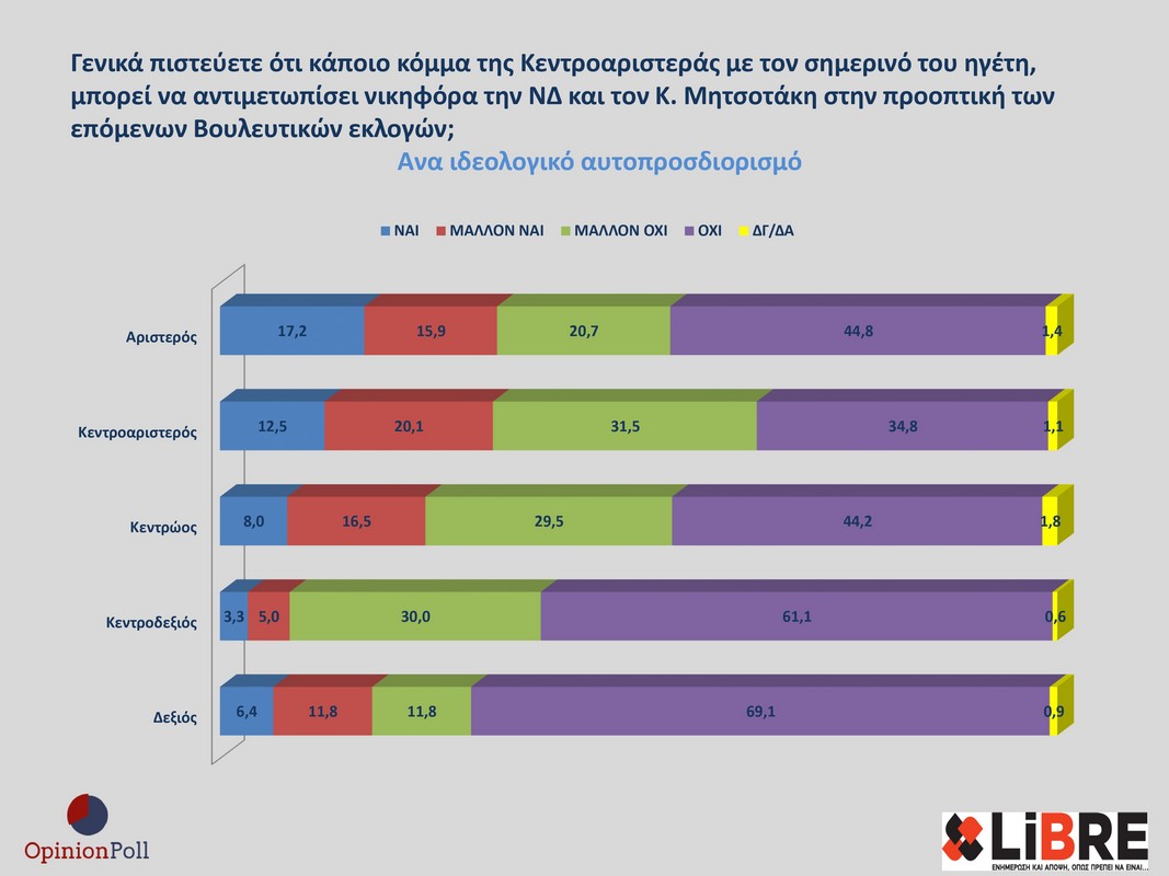 Ωστόσο, το 59.3% θεωρεί θετική εξέλιξη μια σύγκλιση των δυνάμεων της κεντροαριστεράς και πιστεύουν ότι θα την καθιστούσαν υπολογίσιμο αντίπαλο στην Ν.Δ. Αντίθετη άποψη έχει το 37.4%.