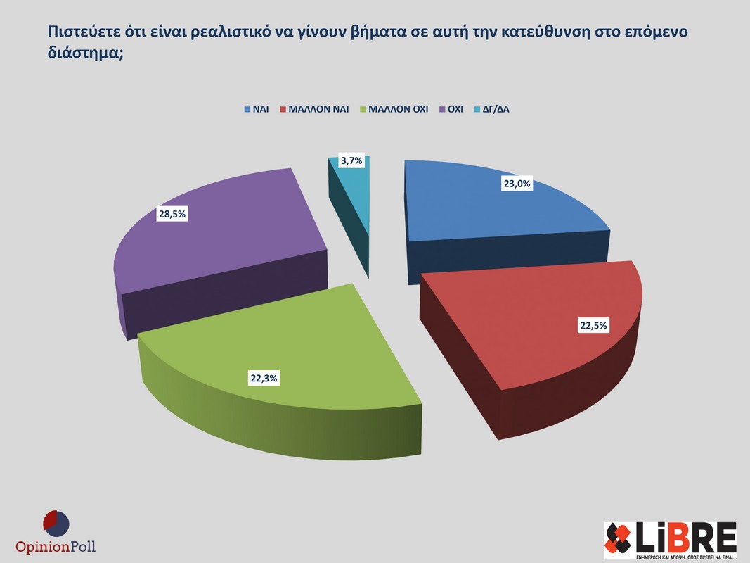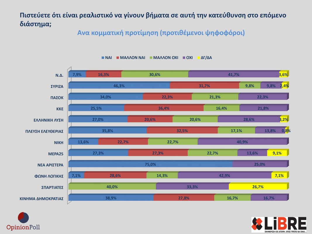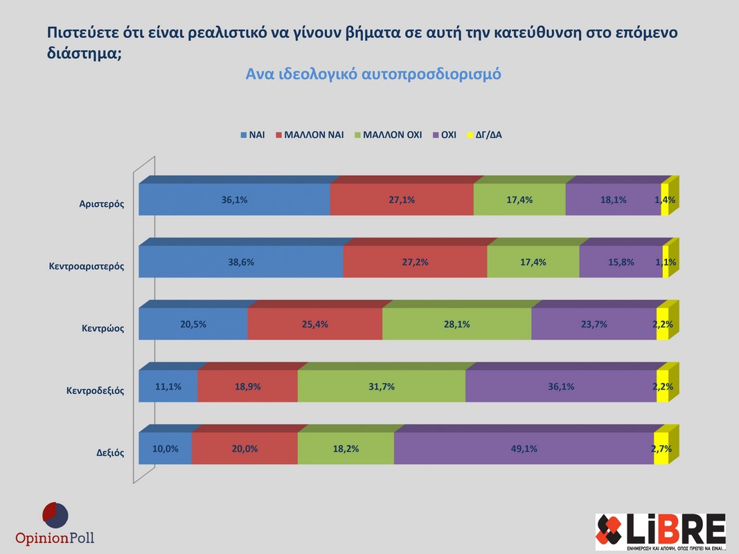 Είναι φανερό ότι η αίσθηση της αδυναμίας των κομμάτων της κεντροαριστεράς φέρνει ως ανάγκη και ως ελπίδα σύμφωνα με τα ευρήματα την ανάγκη σύμπλευσης και συμπόρευσης. Ταυτόχρονα βέβαια το 45.5% το θεωρεί ρεαλιστικό να γίνουν βήματα στο επόμενο διάστημα σ΄αυτή την κατεύθυνση στο επόμενο διάστημα, ενώ το 50.8% έχει αντίθετη άποψη.